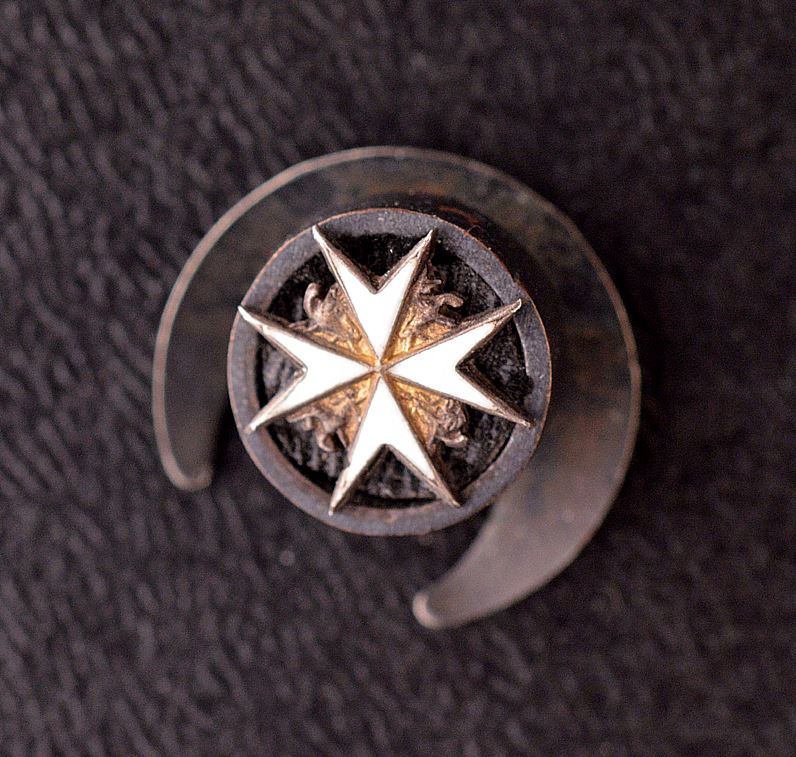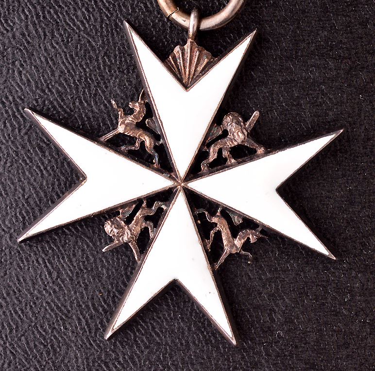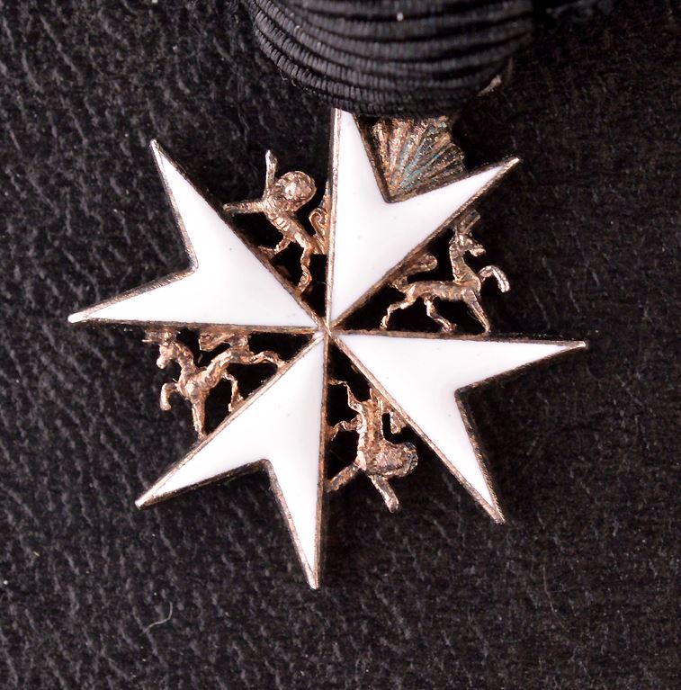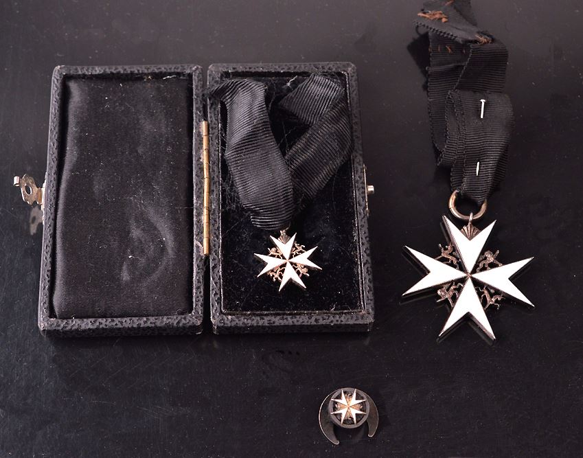Great Britain, Order of St. John, shoulder badge, silver, white enamel, a bit of light contact, with ribbon; Miniature medal in box of issue, VF, ribbon frayed; lapel pin; total three pcs.