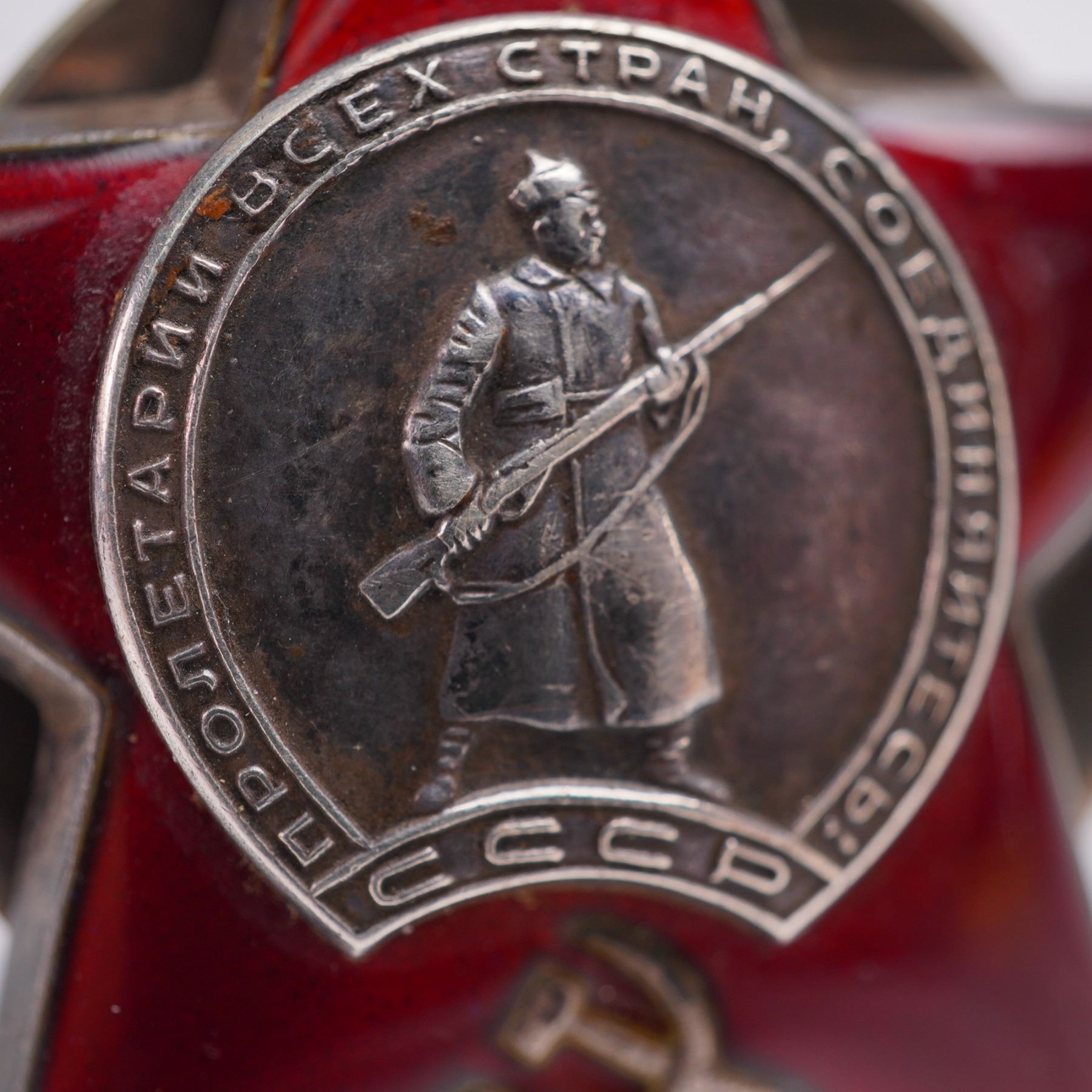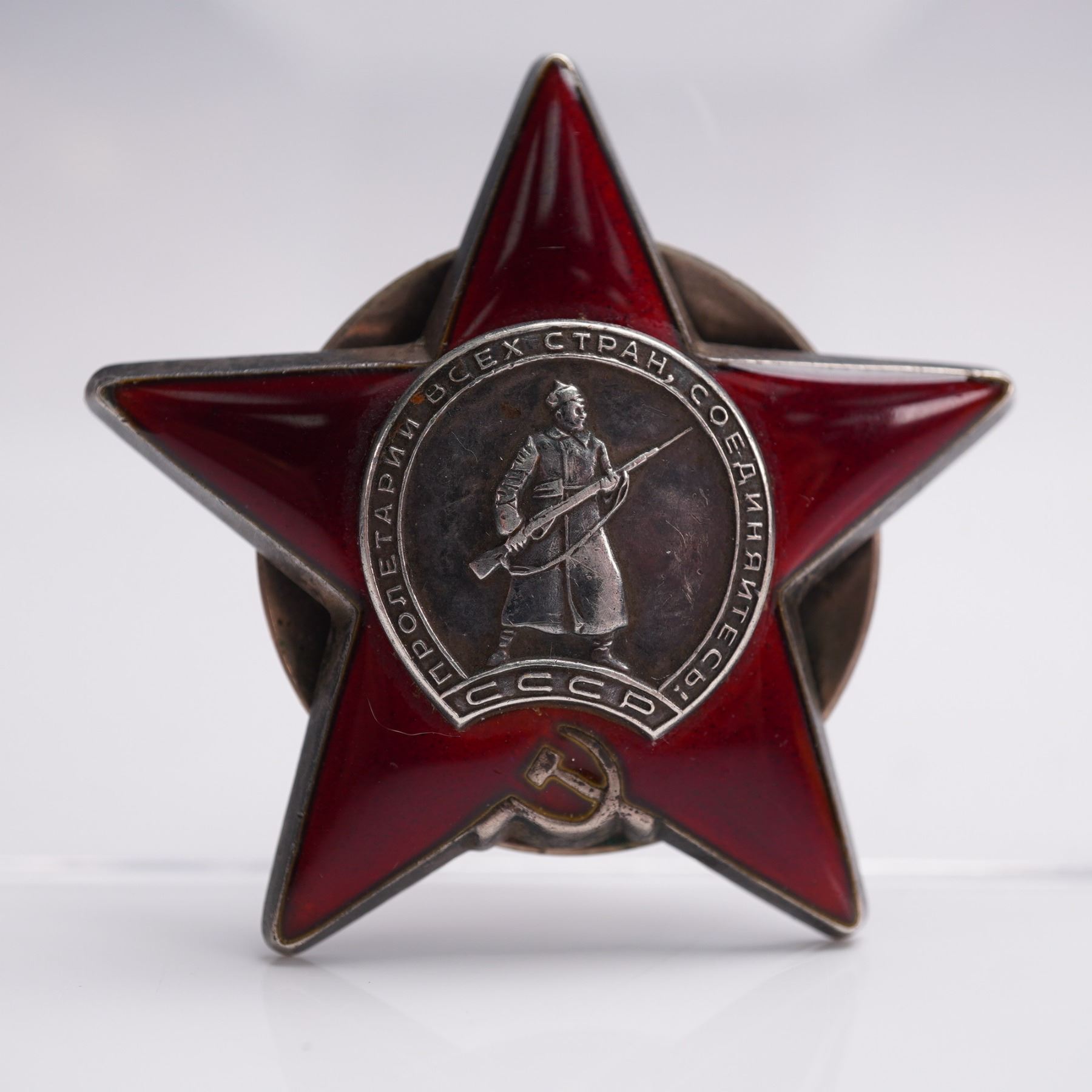 A powerful symbol of Soviet valor and a rare military relic, this authentic Order of the Red Star medal features the classic five-pointed red enamel star centered with a silver depiction of a Red Army soldier wielding a Mosin rifle, surrounded by the rallying cry Proletarians of all countries, unite! and marked with CCCP. This early screwback version, preferred by collectors for its weight and craftsmanship, represents one of the USSR's most iconic decorations, awarded for exceptional service in defense of the Soviet Union in both wartime and peacetime. Its sharp enamel, raised detail, and heavy construction reflect the pride and resilience of the Soviet era. Whether you are a militaria enthusiast or a student of Cold War history, this piece brings prestige and historic gravity to any collection.