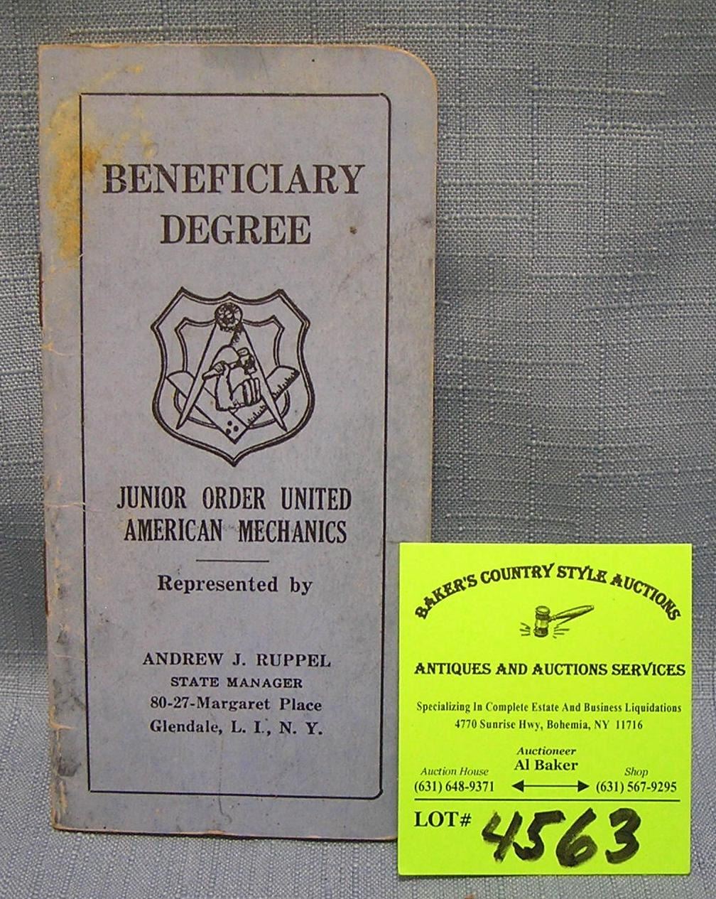 Junior Order of the United American Mechanics benefit booklet circa 1930’s $25.00-$30.00