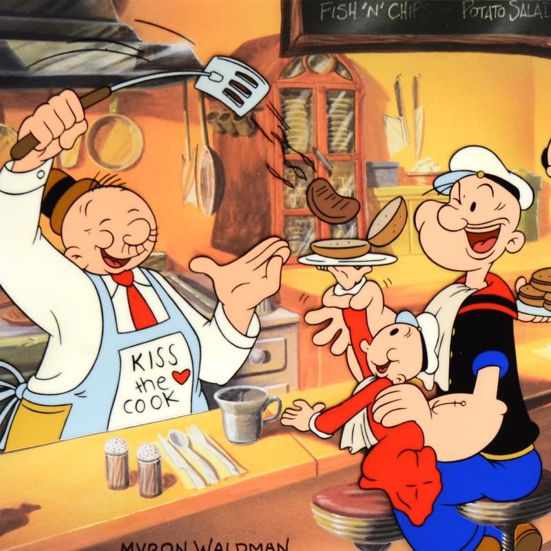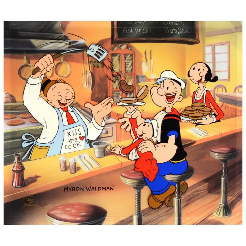 "Orders Up" is a limited edition hand inked and hand painted animation cel with background, numbered and hand signed by Myron Waldman (1908-2006). Includes Certificate of Authenticity! Measures approx. 14" x 12" (background), 10" x 8" (cel).