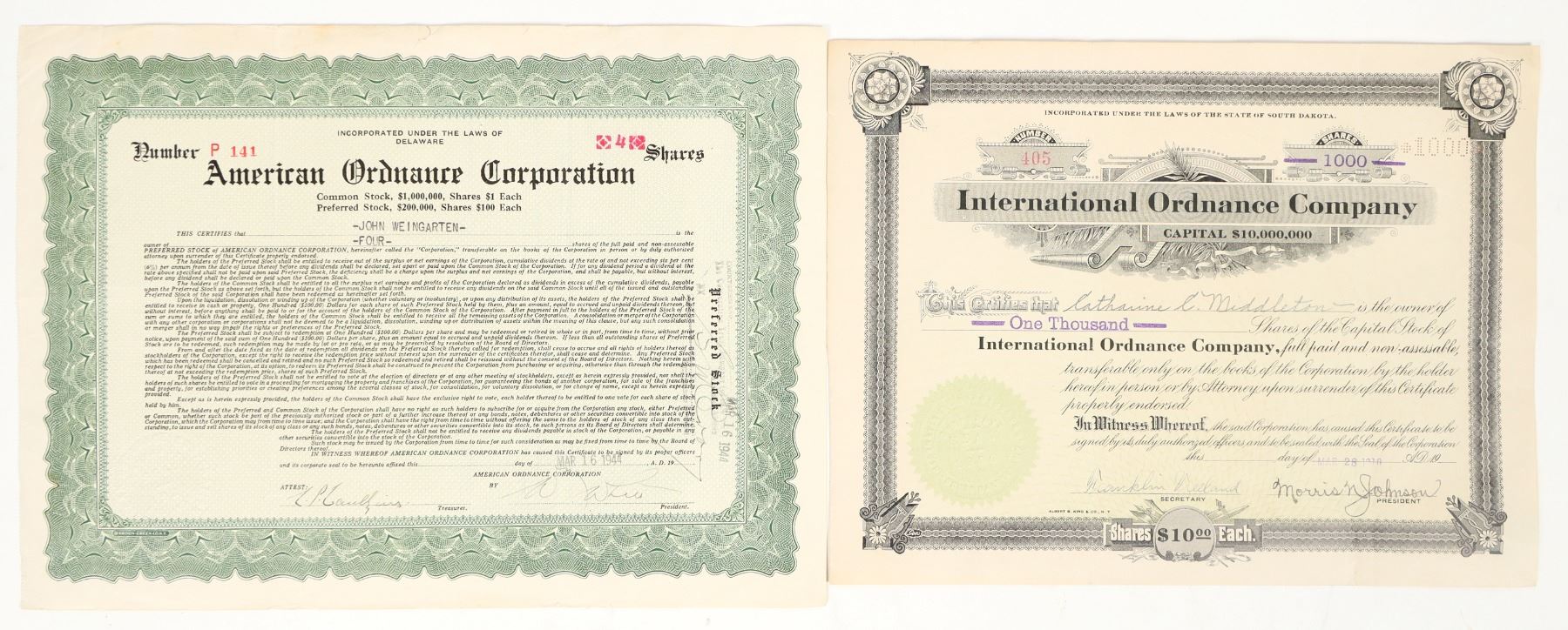 Two Stocks: 1) International Ordinance Company Stock No. 405 for 1000 shares, issued Mar 28, 1910 to Catherine Middleton, not cancelled. Signed by Morris N. Johnson, President and Franklin Freeland, Secretary. Embossed seal. 2) American Ordinance Corporation Stock Number P 141 for 4 shares issued to John Weingarten March 16, 1944, signed by President and Treasurer. Uncancelled. Sold as antiques - no securities value. See photos for additional information/condition.