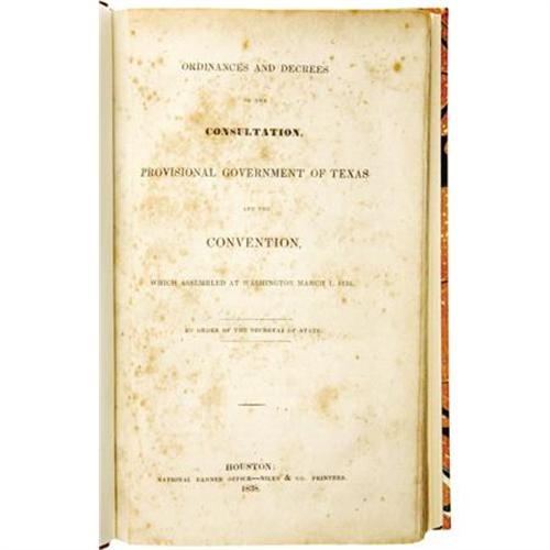 <B><I>Ordinances and Decrees of the Consultation, Provisional Government of Texas and the Convention, Which Assembled at Washington March 1, 1836. By Order of the Secretay </B></I></B></I><B>[sic]</B></I><B><I> of State.</B></I></B></I> [Houston: National Banner Office - Niles & Co. Printers. 1838.] 156 pp. 8vo. A first edition of the laws that established the ad interim government for Texas in 1836. It contains the <I>Declaration of the People of Texas in General Convention Assembled</B></I> [November 7, 1835], the <I>Plan and Powers of the Provisional Government of Texas</B></I> [November 13, 1835], treaties with the Cherokee and Comanche Indians, and the Texas <I>Constitution</B></I> enacted March 16, 1836, at which time the enemy was literally thundering at the gates of the town of Washington, Texas. Contains the three-page index that did not issue with all copies. <BR><BR>This publication contains highly important acts on the negotiations of treaties with local Indian tribes, most notably the Cherokee and the Comanche. While relations with the Comanche were tense and occasionally antagonistic, the Cherokee declared themselves neutral in the conflict between Texas and Mexico, and were thereby more generally favored by the government of the Republic. <BR><BR>Anxious to ensure Cherokee neutrality, Sam Houston was sent to meet with the tribe in the fall of 1835, and hammer out a treaty. Houston was an adopted member of the Cherokee tribe and became an influential advocate of the Cherokee people. Acting on Houston's recommendation, the Texas government pledged to recognize Cherokee claims to lands north of the Old San Antonio Road and the Neches River and west of the Angelina and Sabine Rivers. Although the proposed treaty greatly reduced their landholdings, the Cherokee agreed to the accord because they believed it gave them a permanent home. Eight Cherokee leaders, including Duwali and Big Mush, signed the agreement in 1836, but the treaty was never ratified by the Texas government. Half-calf case with marbled boards, raised bands and gilt lettering at spine. Slight water damage to title and a few other pages, occasional foxing. <I>From the collection of Darrel Brown.</B></I><BR><BR><B>Reference:</B></I> Streeter 456. Howes T133. Rader 3056. Raines, p. 229. Sabin 94959. Eberstadt, Texas 162:195. Donated to the Texas State Historical Association by Shirley and Clifton Caldwell.<BR><BR><b>Shipping:</b> Books & Catalogs (<a target="_blank" href="http://www.heritageauctions.com/common/shipping.php">view shipping information</a>)