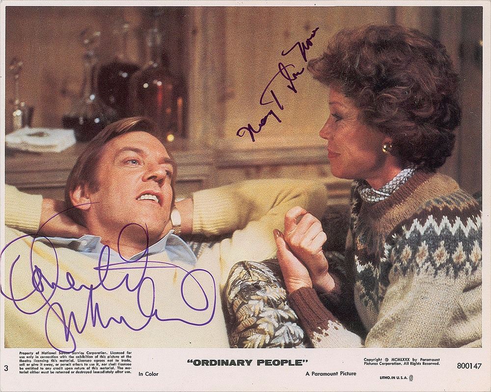 Color Paramount Pictures mini lobby card for the Oscar-winning 1980 film Ordinary People, 10 x 8, signed in purple felt tip by Donald Sutherland and Mary Tyler Moore. Ordinary People won four Oscars at the 53rd Academy Awards, including Best Picture and Best Director. In fine condition. From the Harvey and Rhoda Kuflik Collection.
