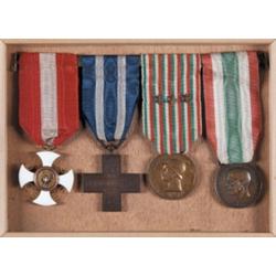 Regno d'Italia - Intorno al 1920 - Striscia di n. 4 decorazioni complete di nastro e montate su una barretta - Entro un apposito contenitore in legno