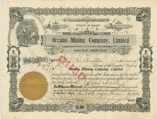 1906, Idaho. Black/White with gold seal. Stock certificate for 50 shares. Vignette of miners at work at top left and small vignettes of miners working at top, center and bottom margins right and left.