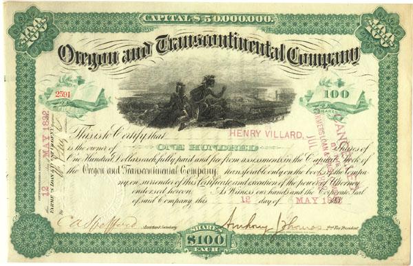 1882, Stock certificate for 100 shares of the Oregon and Transcontinental Company. Green/Black. Nice engraved vignette of Indians overlooking a valley with steam locomotive. Issued to and signed on verso by Henry Villard. The Oregon and Transcontinental Company was a holding company organized by Henry Villard. The company controlled the Northern Pacific and Oregon Railway and Navigation Company which was a dominant force among railroads in the Northwest. Lightly stamp and punch cancelled and Extremely Fine.