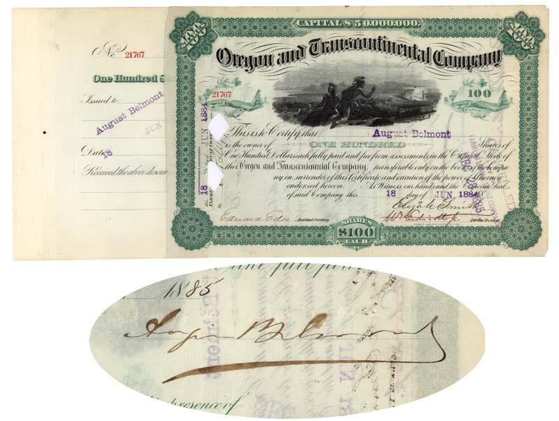 1884, New York. Stock certificate for 100 shares. Green. Vignette of two Native Americans looking down on a busy landscape that includes trains, factories, and ferries. Issued to and signed on verso by August Belmont. Punch and stamp cancelled.