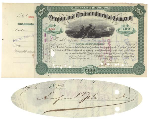 OREGON AND TRANSCONTINENTAL COMPANY STOCK ISSUED TO AND SIGNED ON VERSO BY AUGUST BELMONT 1884, New York and Oregon. Stock certificate for 100 shares of the Oregon and Transcontinental Company. GreenBlack. Engraved panoramic view of Indians overlooking a riverside town with passing steam locomotives. Issued to and signed on verso by AUGUST BELMONT AUGUST (1816-1890). Financier; Diplomat. At the age of fourteen, Belmont began working at the office of the Rothschilds in Frankfurt, Germany. His skill for finance won him numerous promotions within the company until in 1837, during the financial panic, he formed his own company in New York with his only tangible asset being that of his agency in the U.S. for the Rothschilds. Within a few years, Belmont was one of the leading bankers in the nation. The Oregon and Transcontinental was organized by Henry Villard as a holding company for a vast empire of Nortwestern railway and improvement interests to better integrate them into a harmonized system of railways. The certificate is punch and stamp cancelled. Belmont's signature on verso remains uncancelled and bold. A few pinholes. Fine.