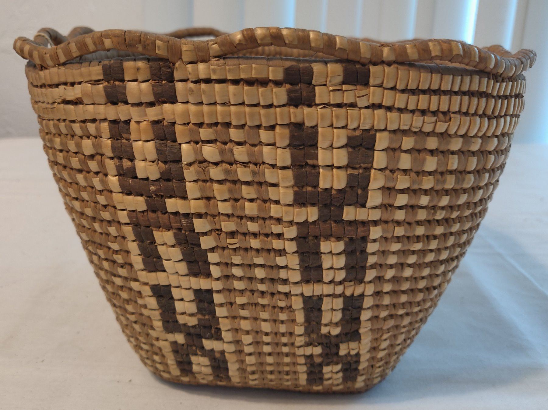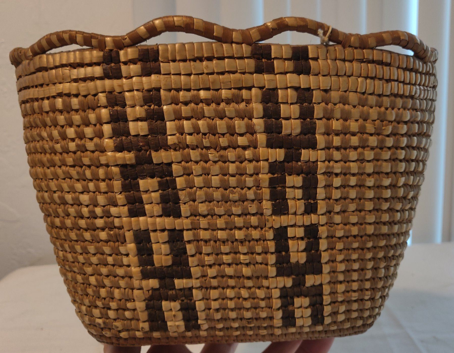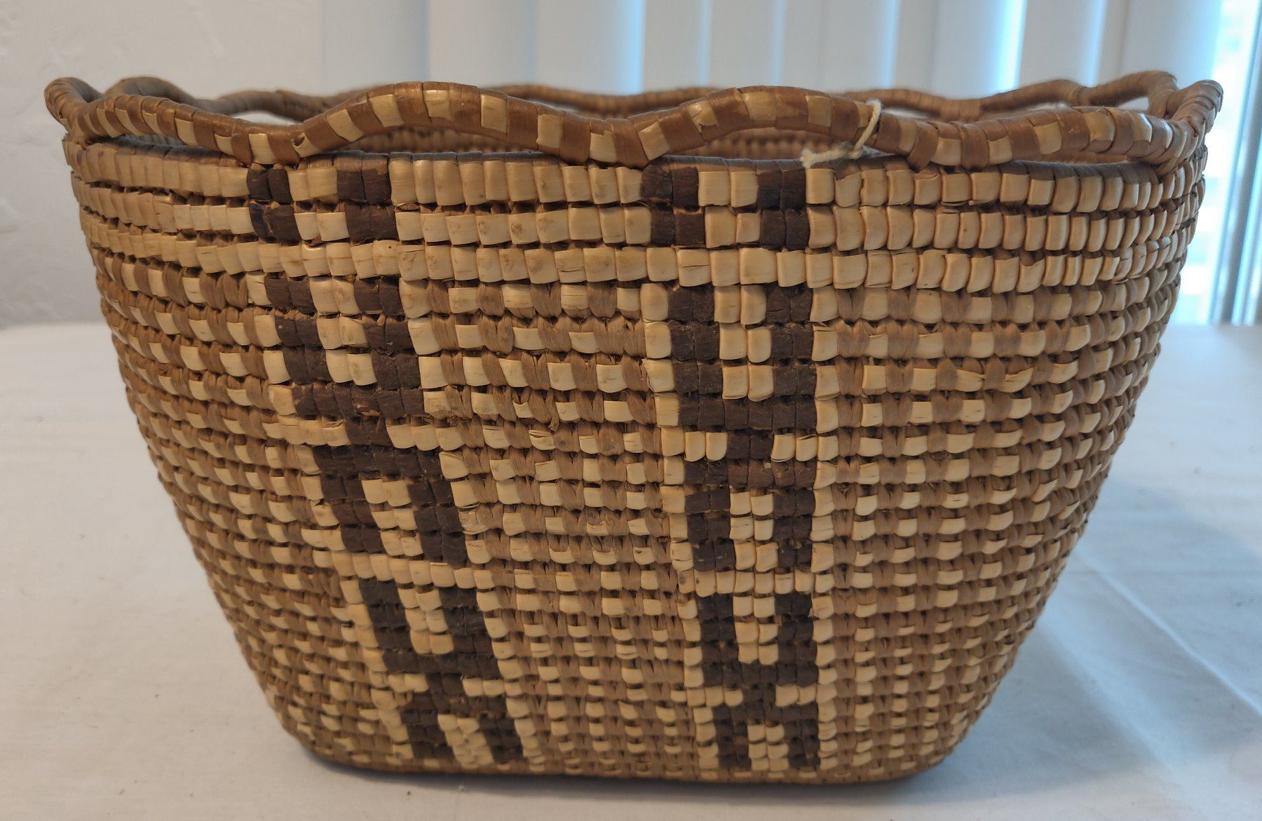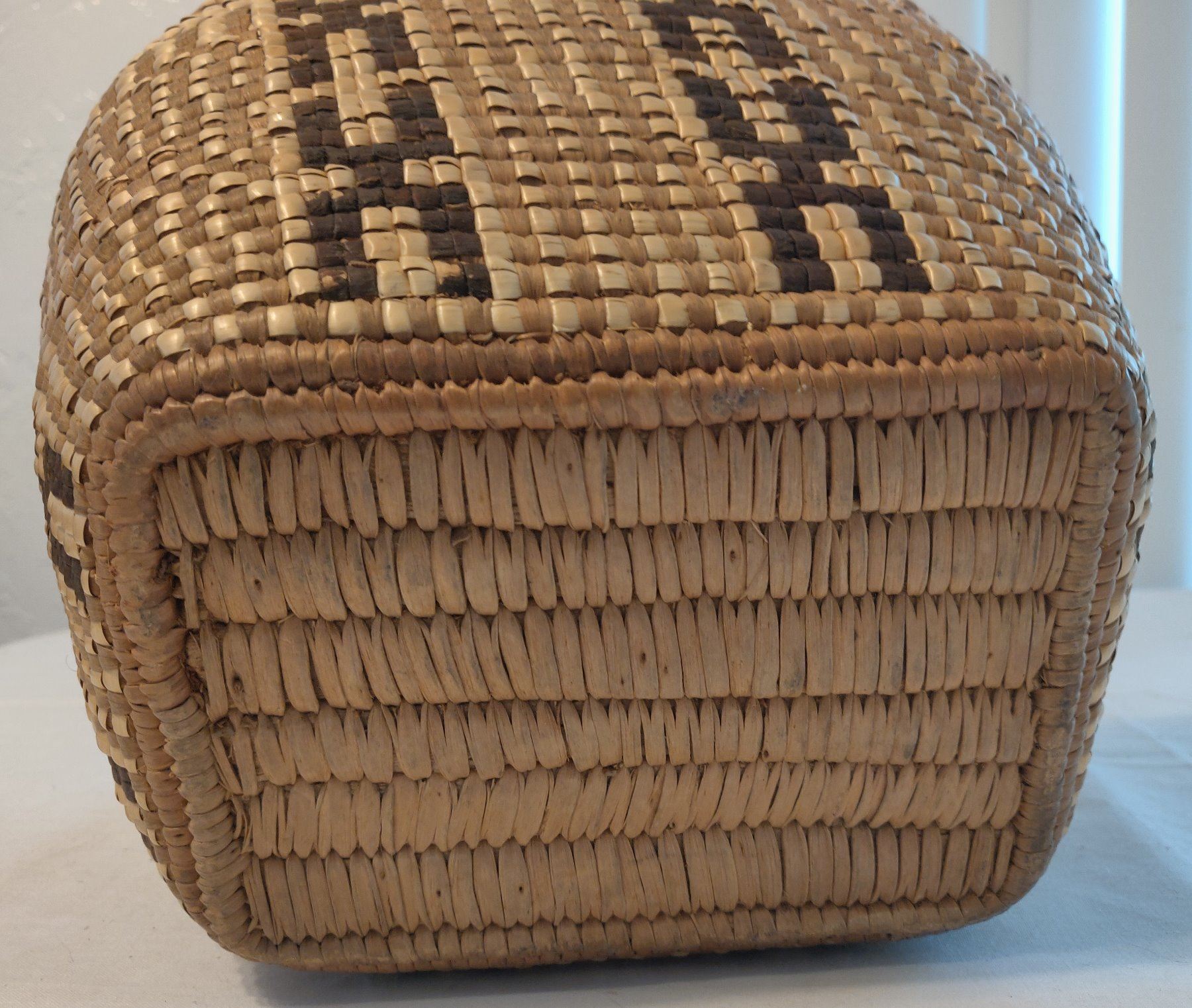 Oregon Berry Basket, c. 1940s. Made of cedar bark, the item measures 10" x 9" x 7". Thompson River, Oregon. Nicely done, imbricated basket. Condition: Good, see images. Shipping: $25.00 w/insurance and signature.