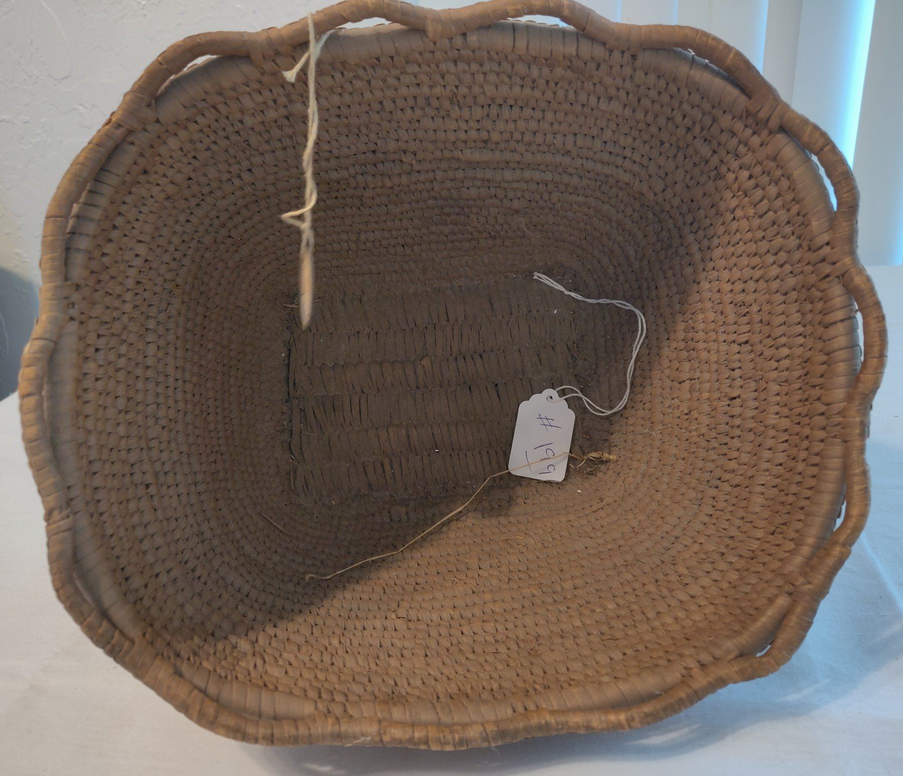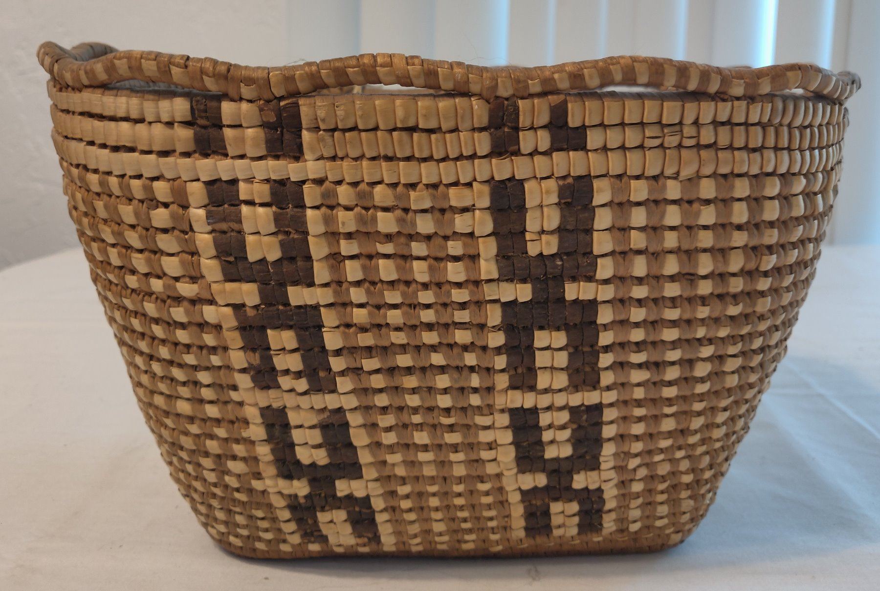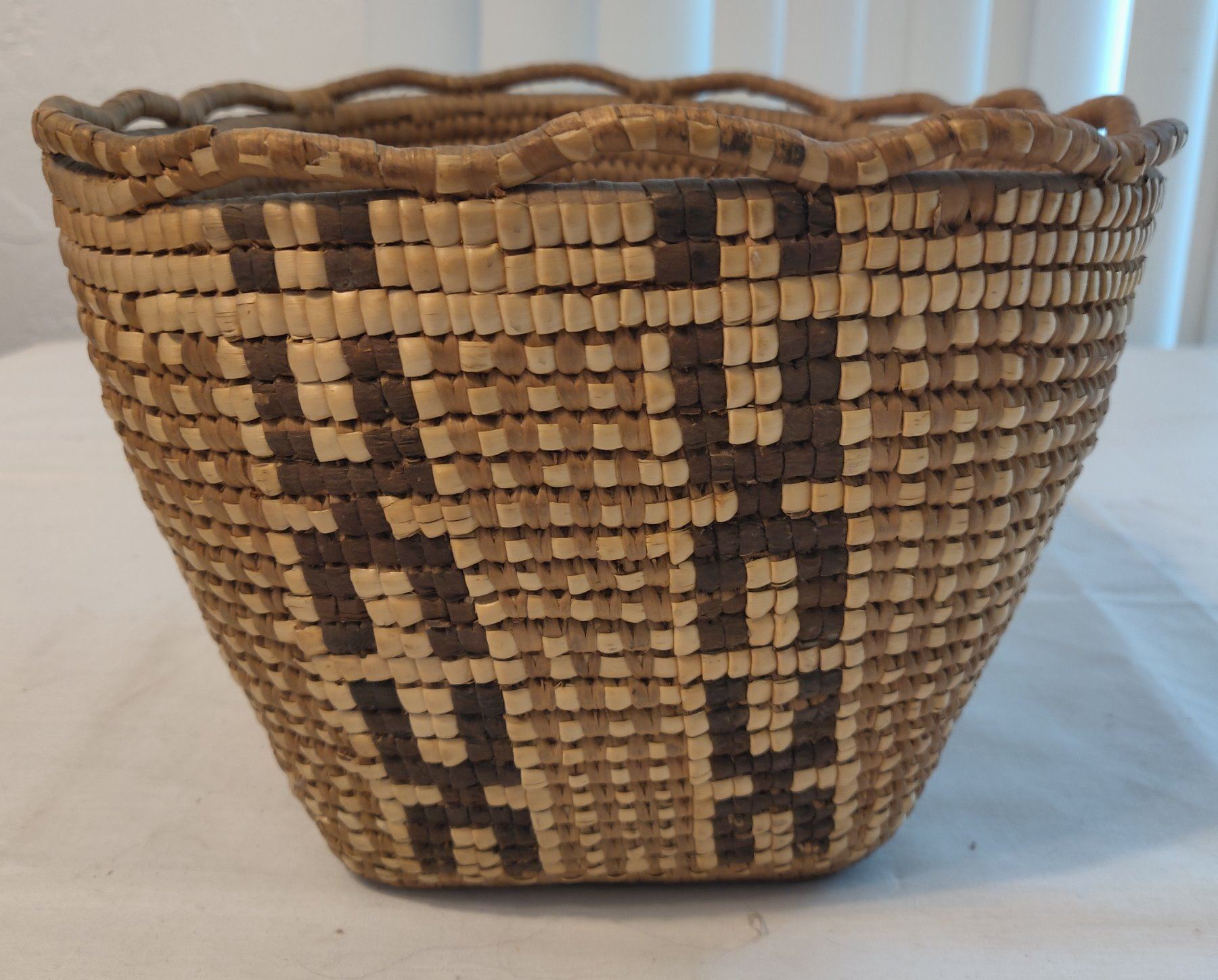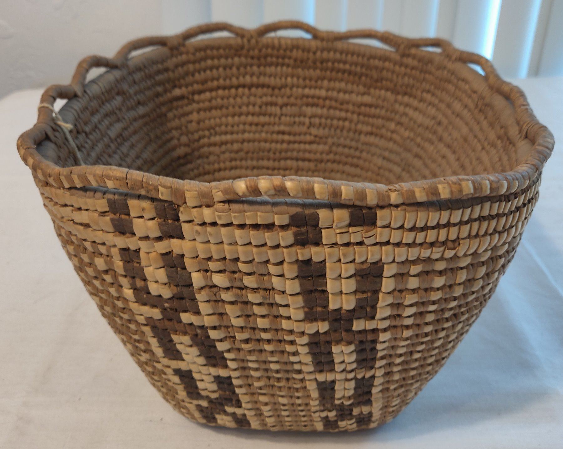 Oregon Berry Basket, c. 1940s. Made of cedar bark, the item measures 10" x 9" x 7". Thompson River, Oregon. Nicely done, imbricated basket. Condition: Good, see images. Shipping: $25.00 w/insurance and signature.