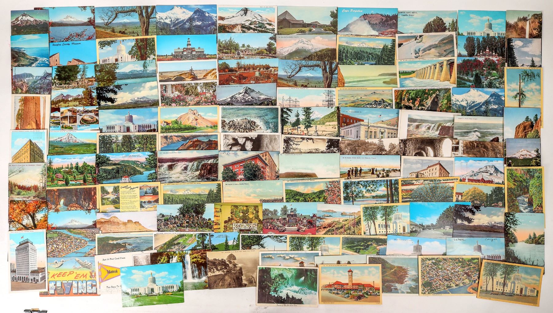 Lot of 110. Five RPC's, Borderless, wht and amber borders. Postmarks i.e; Portland, Seaside,Salem, Myrtle Creek, Centralia WA., Denver CO., Beaverton and Klamath Falls w/Martha Wash. 1 1/2 cent stamp. Street level views : Mitchell Tunnel, fish hatchery Bonneville, Crater lake, Bird of Paradise-Oregon Caves, views of Mt Hood, gov't bldg's, harbor scene-Portland (square rigged ships), Petersen Rock Gardens, Oregon Coast Highway. Birdseye view: Crown Point Vista House, Otter Creek rock, Crown Point Columbia River, Portland. Oregon 1908-57 Ken Prag Collection