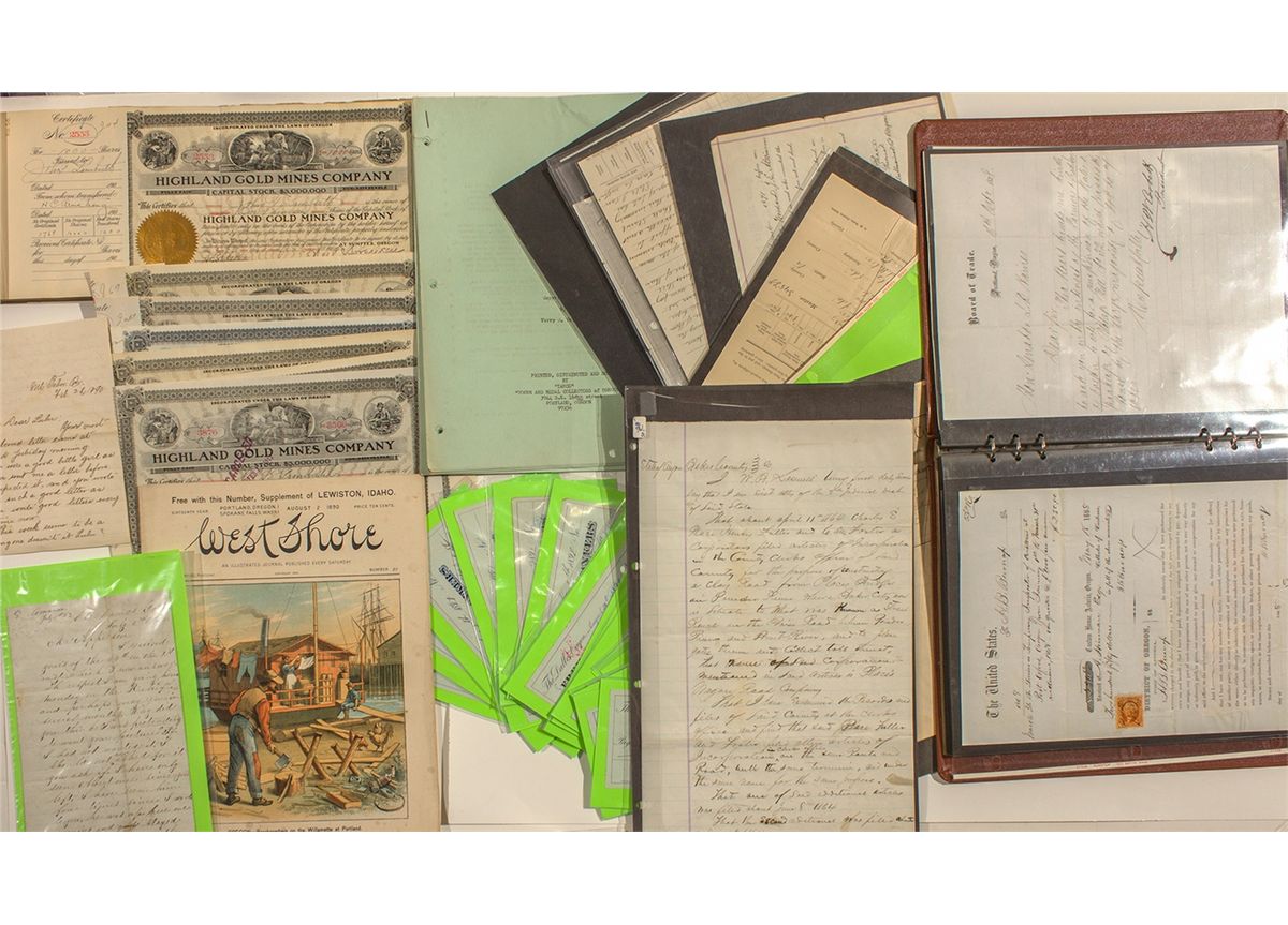 c1854 Includes gold rush era documents. 113 pieces plus oregon place names manuscript. Stage coach (8) 1864-1890, letters (29) 1854 includes gold rush, magazine (1), letterheads (11) 1867-c1900, checks (19) 1898, mining stocks (40) Highland Gold Mines 1903, pc's (5). Lynn Langdon Collection - HKA#65629