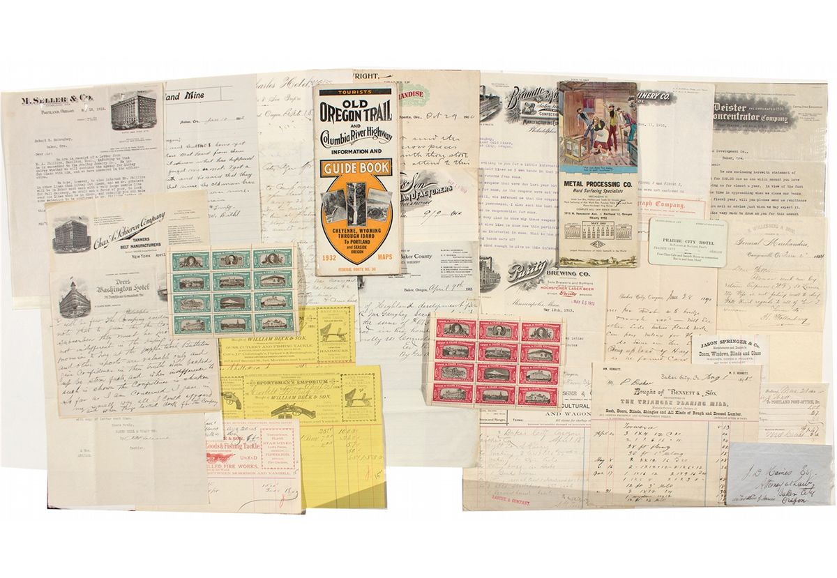 c1865 Lot of 54: large group of documents, letters, stamps, letterhead documents, receipts, a map of the Old Oregon Trail from 1932, invoices, and more. There is a Lewis & Clark Centinniel button, and a sounvenir book mark from the 1905 Lewis & Clark Exposition. These pieces represent vendors, individuals, motels, lawyers, miners, and many others. There is a letter from G.H. Branscomb, U.S. Consulate in Manchester England, to a J.D. Caimes Esq. dated July 2, 1870. A very eclectic mix, and a great amount of history. Lynn Langdon Collection - HKA#65652