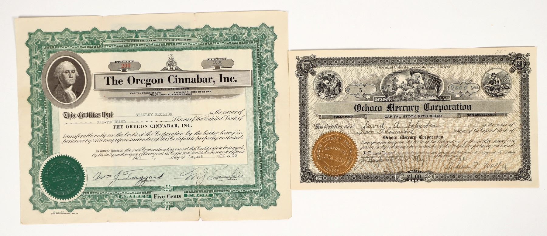 Lot of 2. I/U, 1936, The Oregon Cinnabar, Inc., Diers Printing Co printer. Tri-fold w/separation at one of the folds. I/U, 1932 Ochoco Mercury Corp. Goes printer. gold corp. seal clear and sharp, certificate is near new.