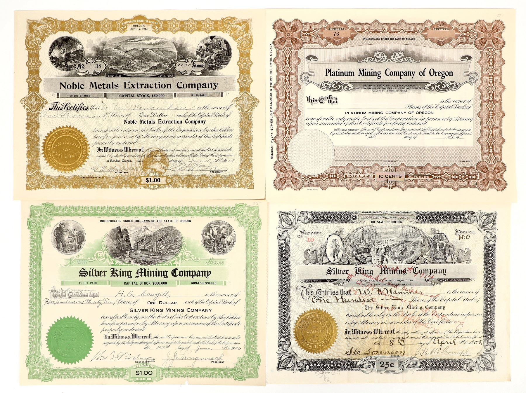 Lot of 4. I/U, 1926 Silver King Mining Co. , goes printer (2) . U/U, dateline 19__Platinum Mining Co. of Oregon, Goes printer. I/U, 1914 Noble Metals Extraction Co., A. Carlisle & Co. printer. Very good or better cond.