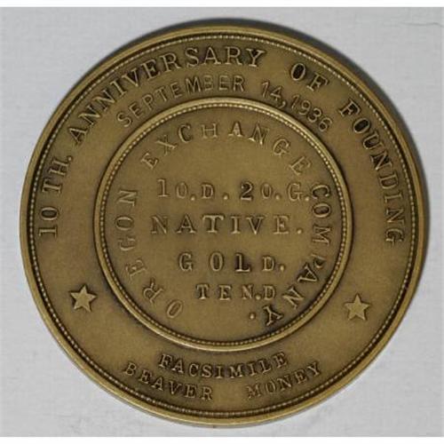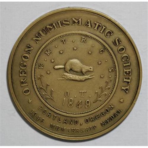 <B>Oregon Numismatic Society 1946 Membership Medal.</B></I> Bronze. 1946 membership medal from the Oregon Numismatic Society's <B>Oregon Beaver Dollar. </B></I>This piece should have been included in the 1963 so-called dollar catalog by Hibler and Kappen alongside HK-573 and it just might be in the new catalog coming out in 2008, listed as HK-573A.<BR><BR><b>Shipping:</b> Coins & Currency (<a target="_blank" href="http://www.heritageauctions.com/common/shipping.php">view shipping information</a>)