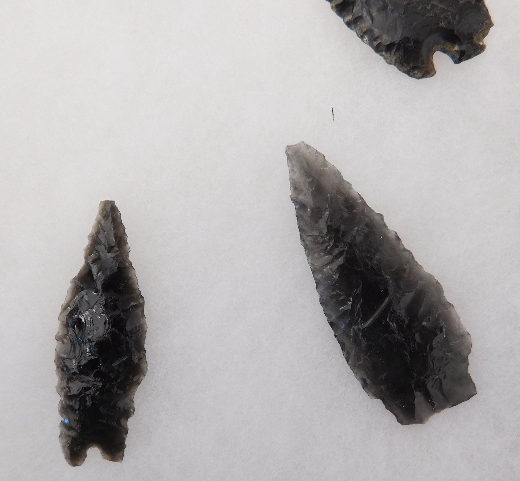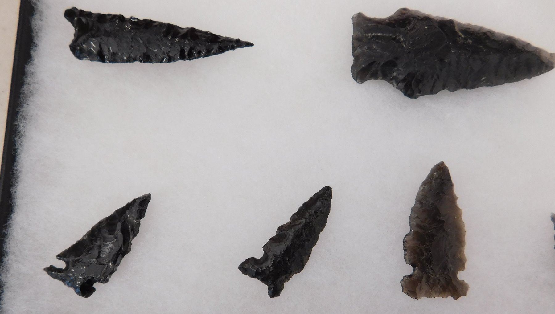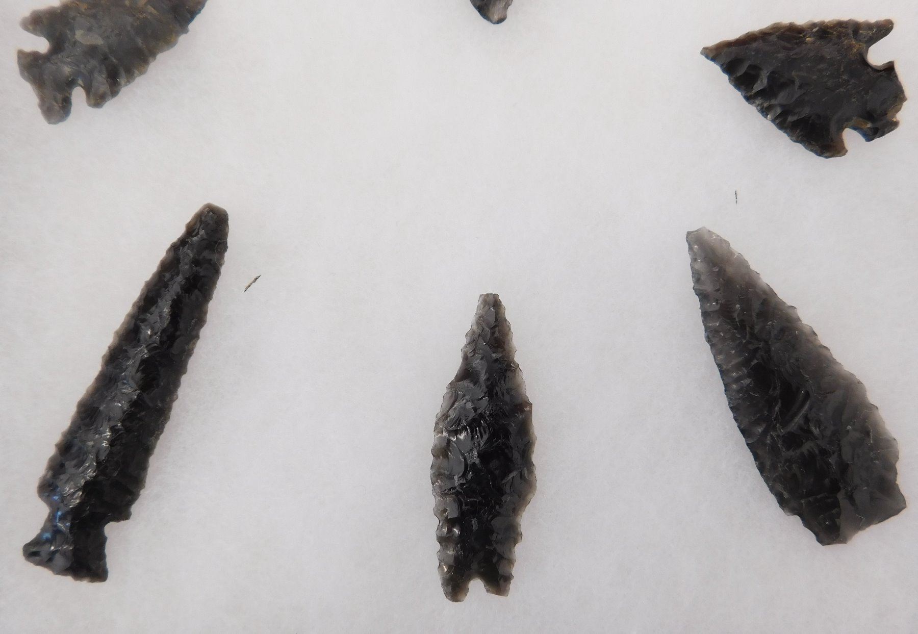Oregon Obsidian Collection, pre-historic items. Made of obsidian, the longest point measures 2 3/4". Klamath Lake, Oregon. Indented bases. Frame not included. Condition: As found, many paleo points, see images. Shipping: $15.50 w/insurance and signature.