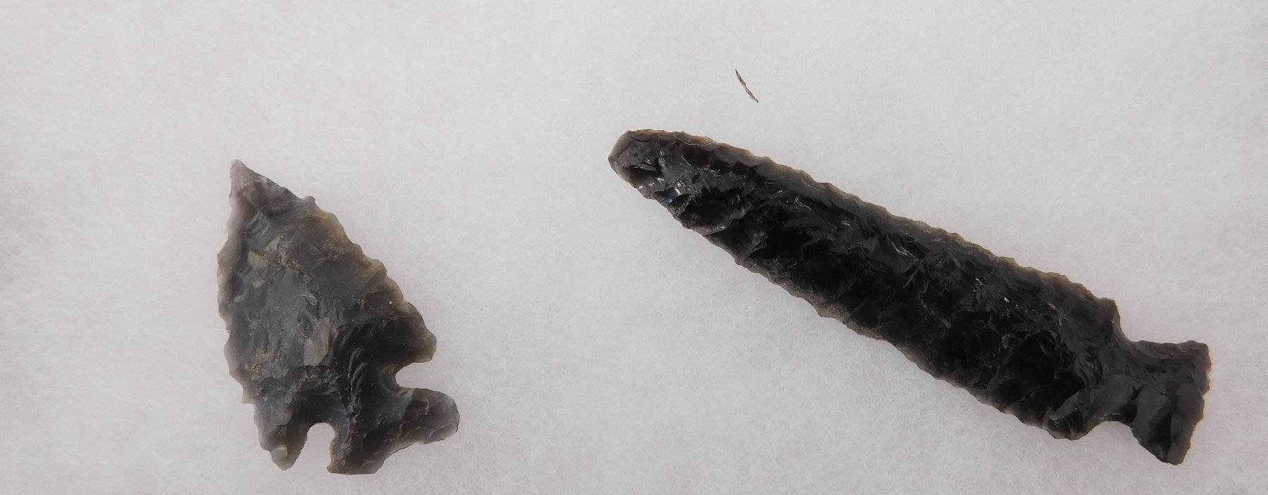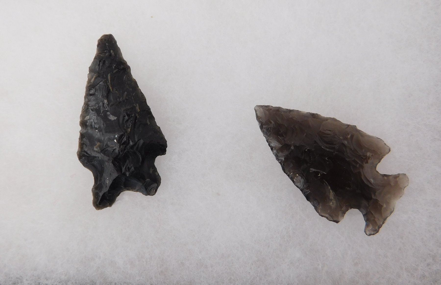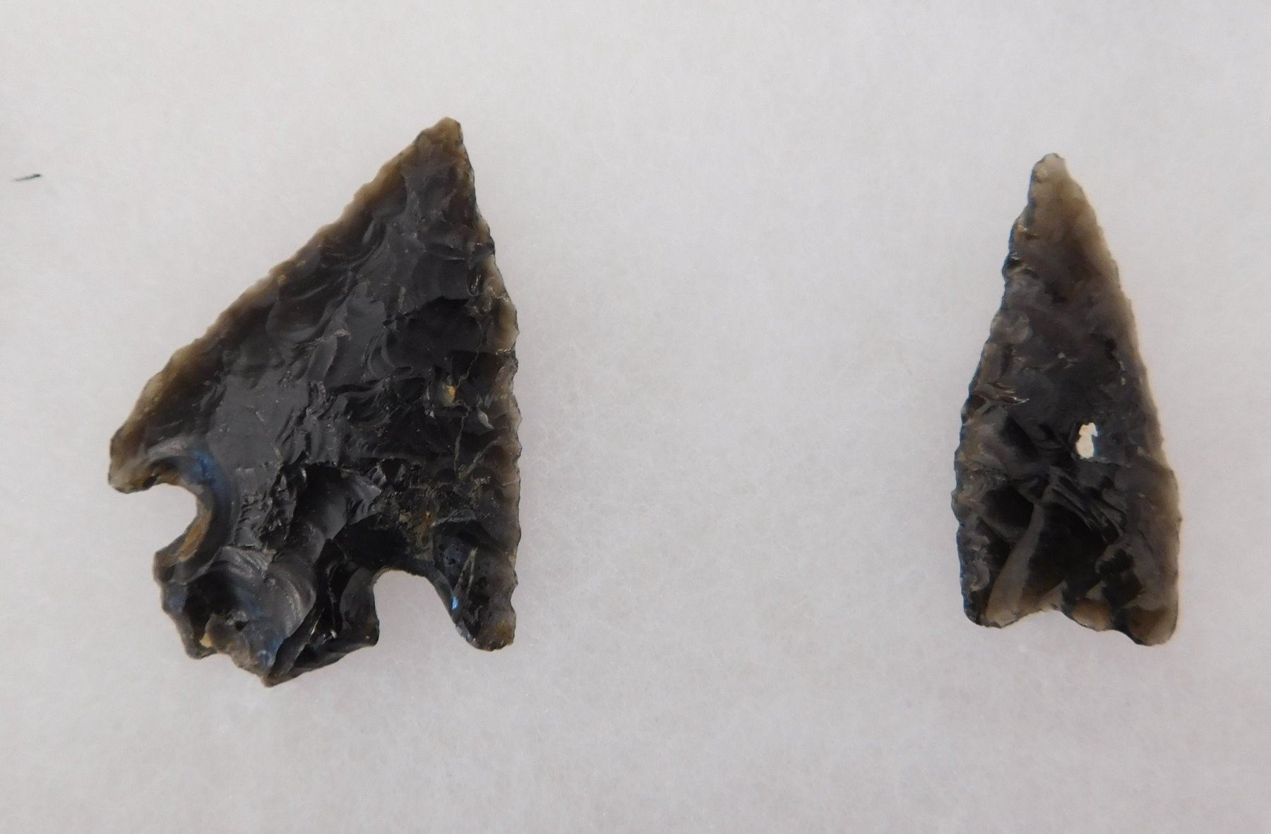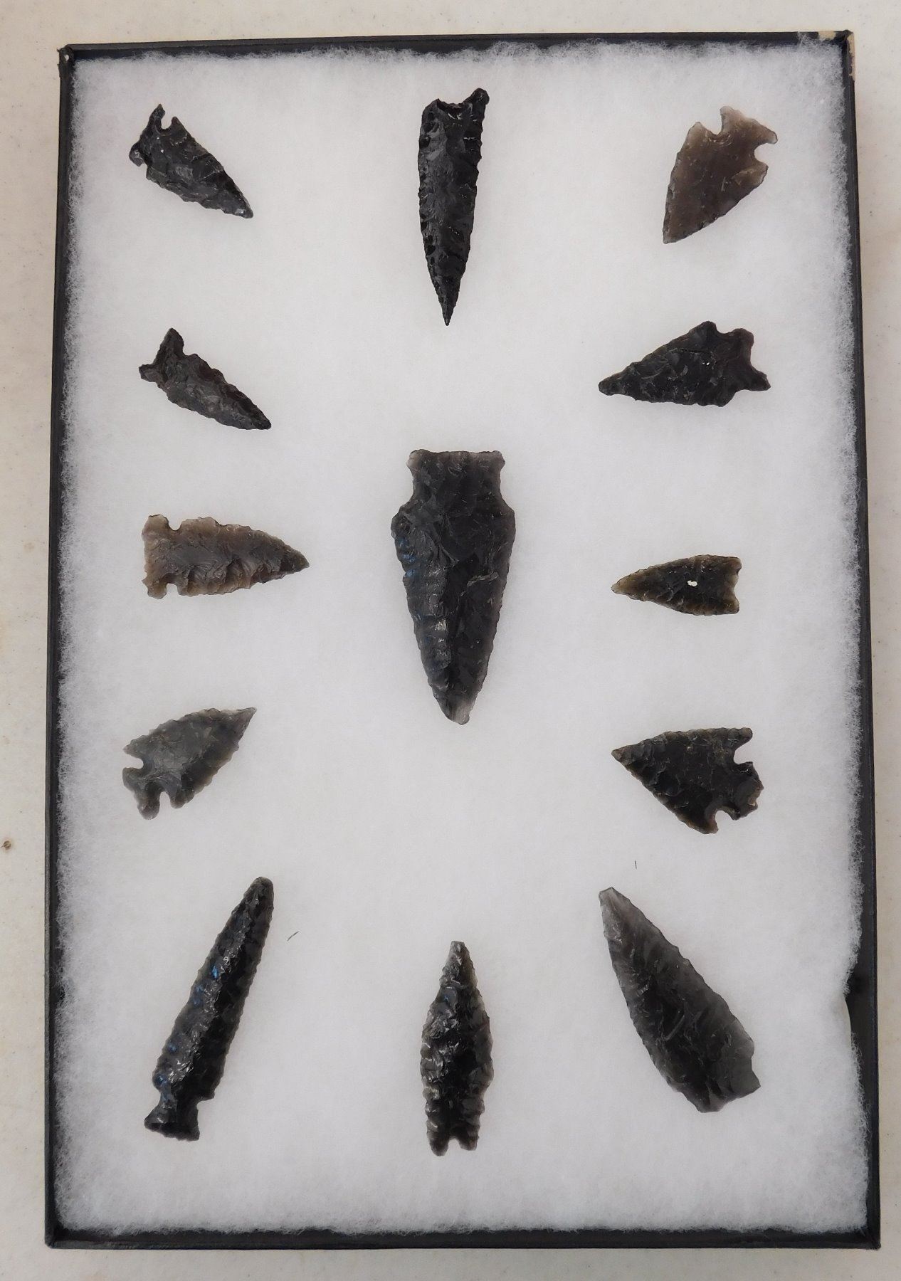 Oregon Obsidian Collection, pre-historic items. Made of obsidian, the longest point measures 2 3/4". Klamath Lake, Oregon. Indented bases. Frame not included. Condition: As found, many paleo points, see images. Shipping: $15.50 w/insurance and signature.