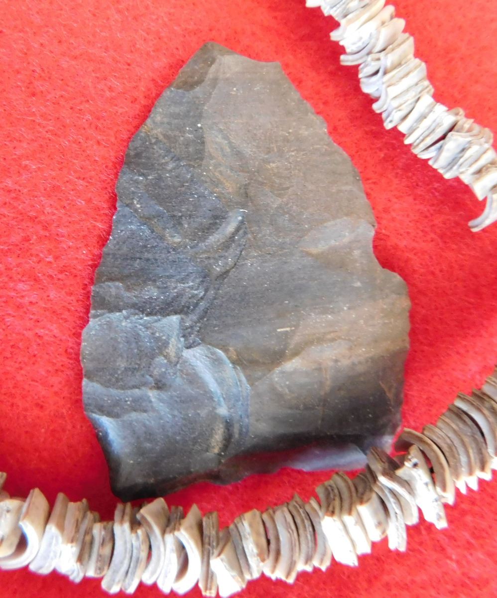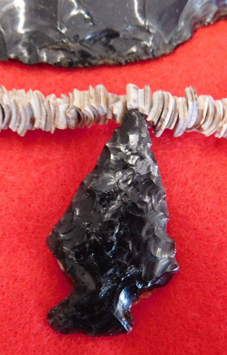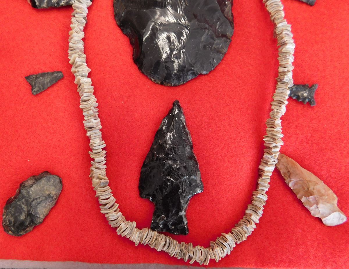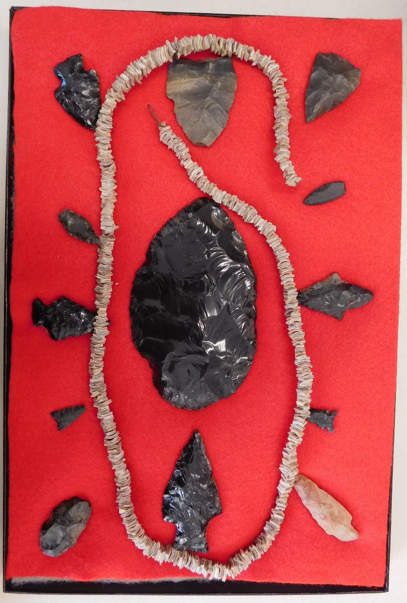 Oregon Relic Collection, pre-historic items. Made of obsidian, chert and shell, largest item measures 4.5" long. From Klamath Falls, Oregon. Necklace has 100s of shell beads and is 30" long. Frame not included. Condition: All as found, see images. Shipping: $17.50.