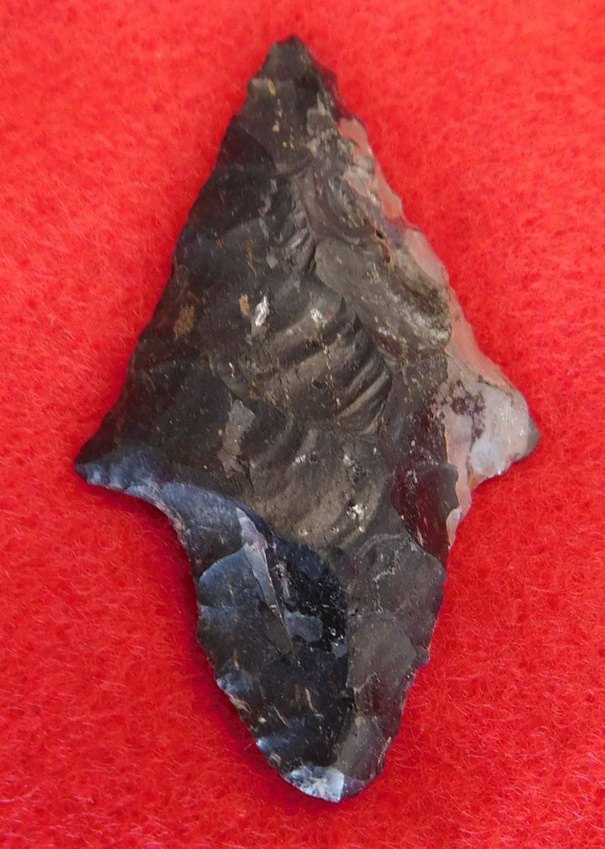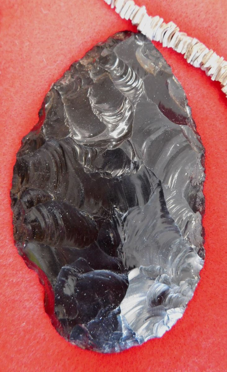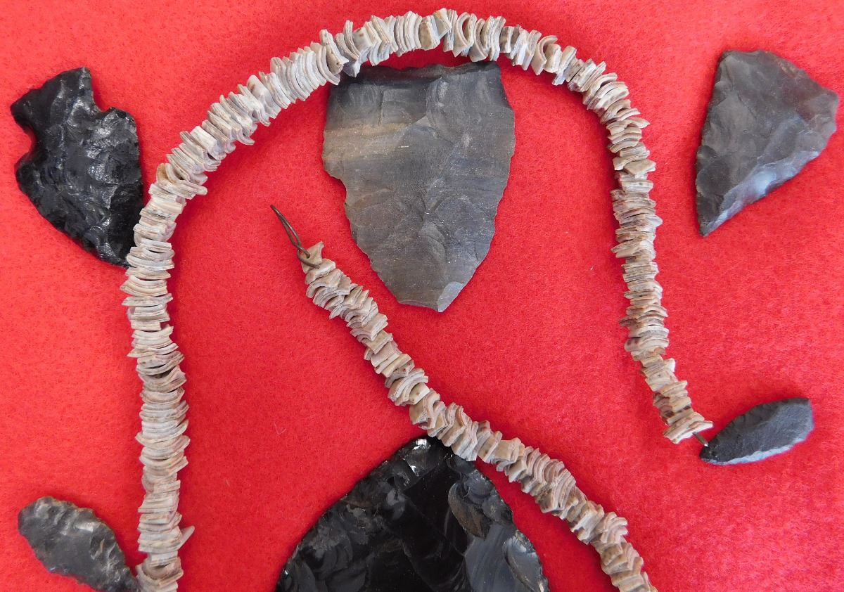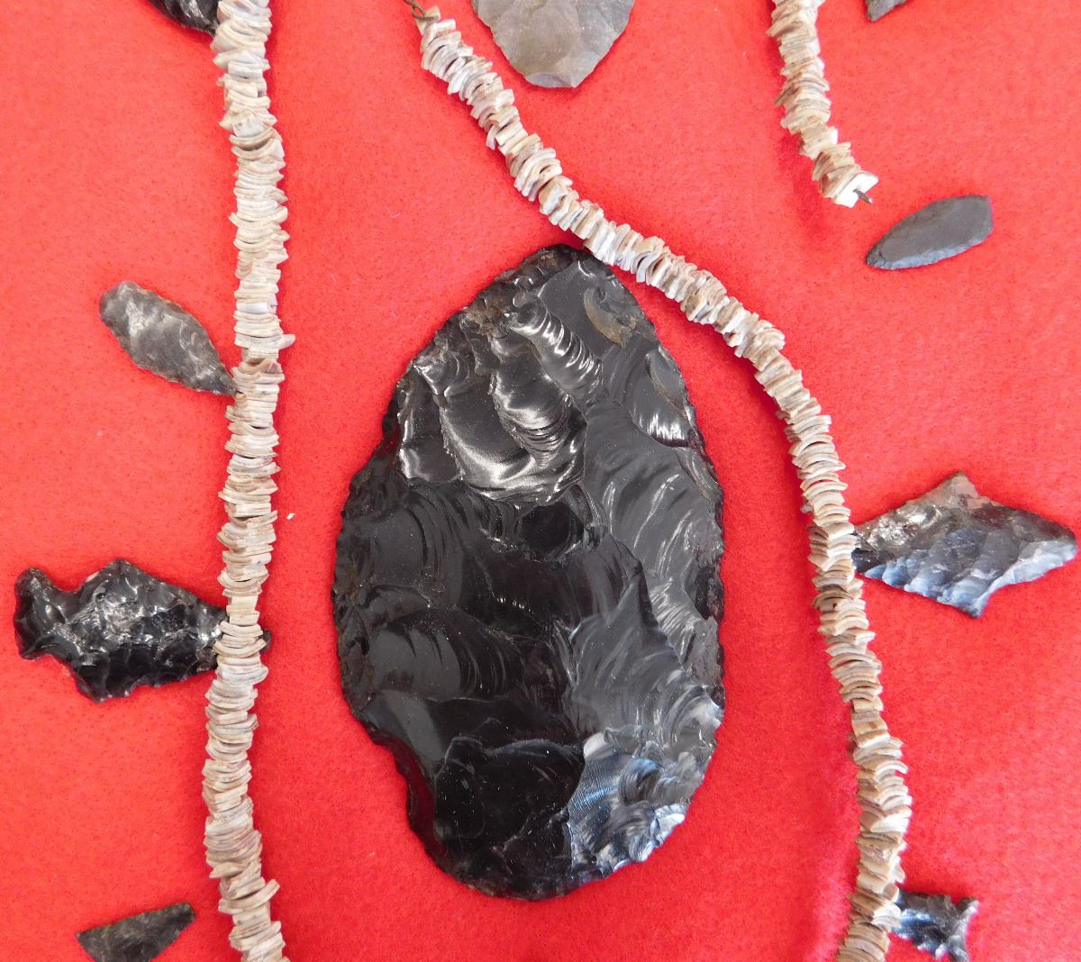 Oregon Relic Collection, pre-historic items. Made of obsidian, chert and shell, largest item measures 4.5" long. From Klamath Falls, Oregon. Necklace has 100s of shell beads and is 30" long. Frame not included. Condition: All as found, see images. Shipping: $17.50.