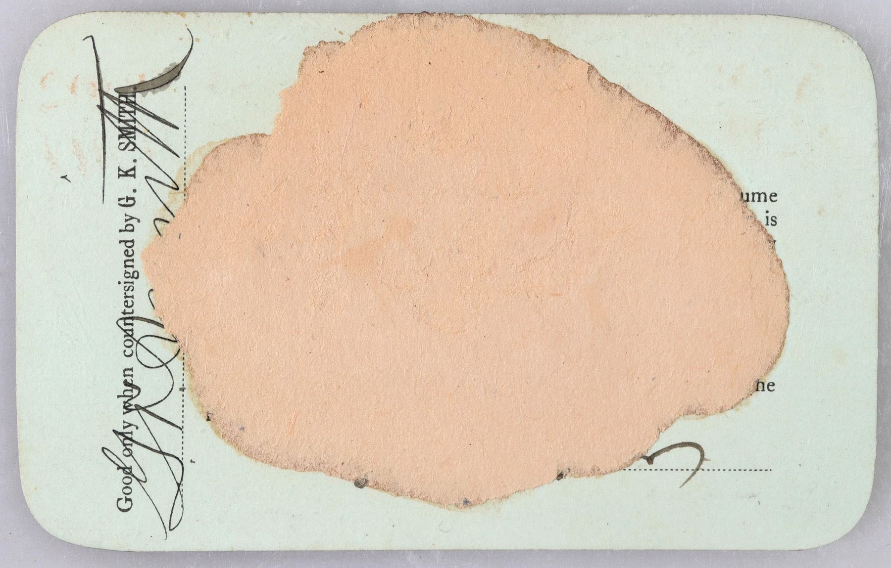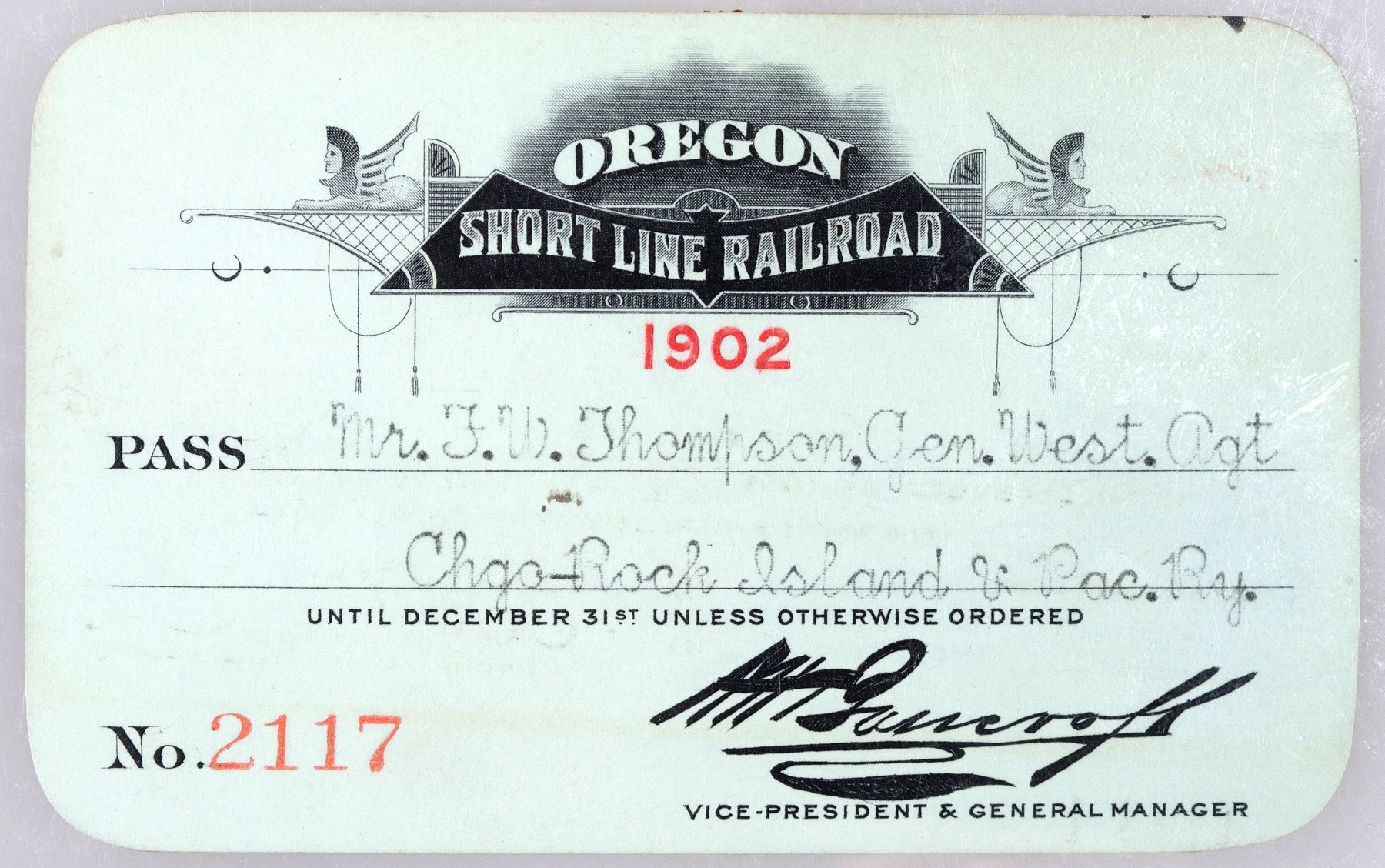#2117 issued 1902 to F W Thompson, Chicago-Rock Island & Pac. RY, signed VP/GM, blue card stock, title vignette: "Oregon" shadow backing Sphinx facing left and right on either side, reverse unreadable, unk printer. Organized in 1881 running thru Ore, Wy, Idaho, Utah, Mont.