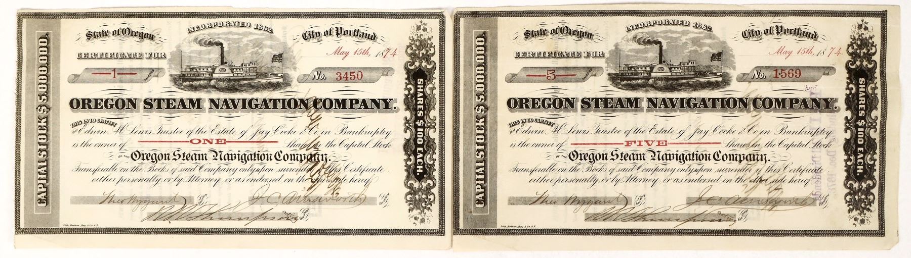 Oregon Steam Navigation Company Stocks (2) 1874. Nice ship vignette. Printed by Corlies & Macy. Henry Winslow Corbett moved from Massachusetts to the Oregon Territory. He was a prominent figure in the early development of Portland, Oregon and was involved in numerous business ventures there, starting in general merchandise. His interests later included banking, finance, insurance, river shipping, stage lines, railways, telegraph, iron and steel and the erection of Portland downtown buildings among other enterprises. He served as a United States senator from 1867 to 1873. The Tiltons were involved with the Oregon Steam Navigation Company. Great Oregon historical pieces!