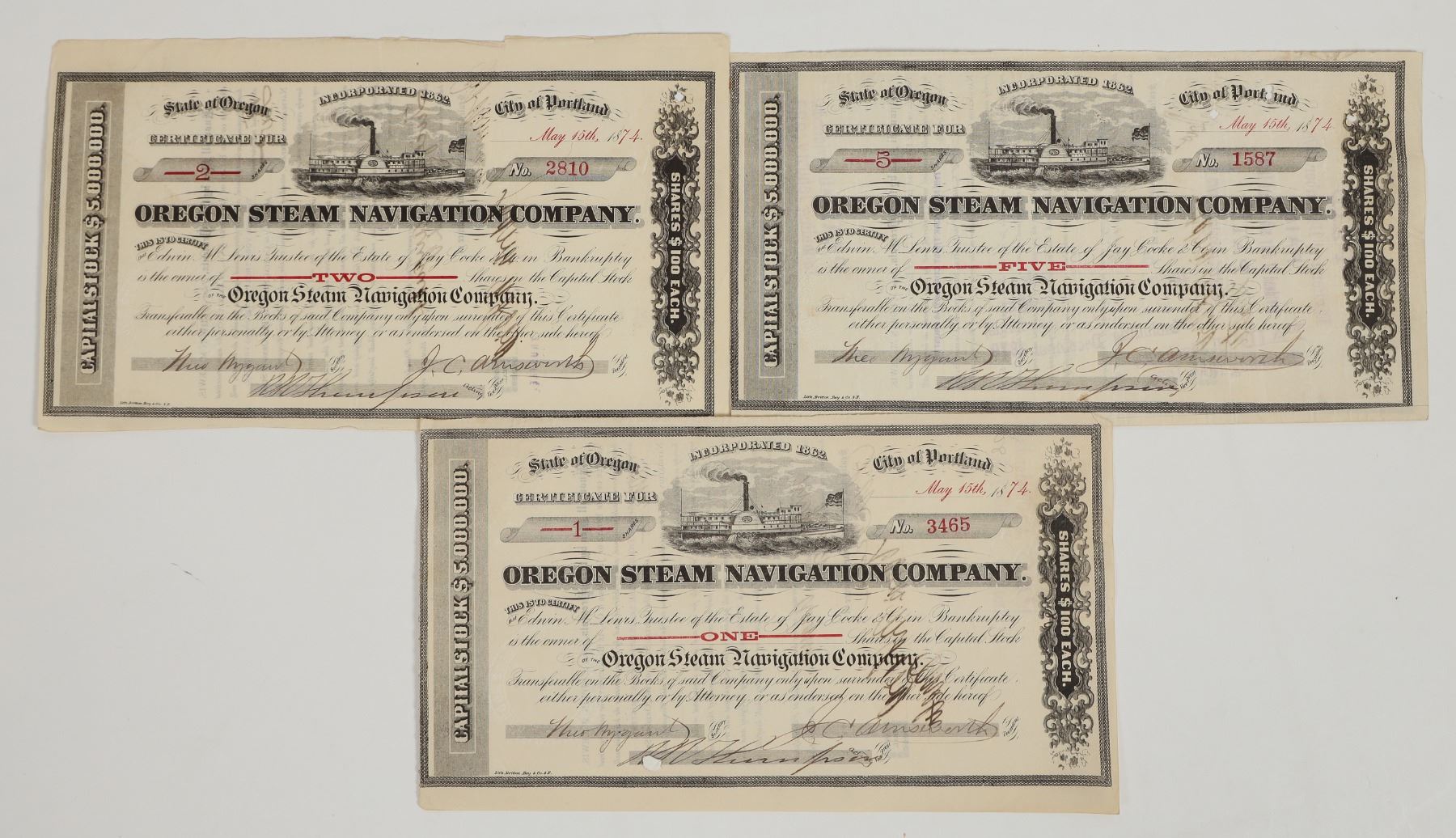 Oregon Steam Navigation Company Stocks (3) 1874. Nice ship vignette. Printed by Corlies & Macy. Henry Winslow Corbett moved from Massachusetts to the Oregon Territory. He was a prominent figure in the early development of Portland, Oregon and was involved in numerous business ventures there, starting in general merchandise. His interests later included banking, finance, insurance, river shipping, stage lines, railways, telegraph, iron and steel and the erection of Portland downtown buildings among other enterprises. He served as a United States senator from 1867 to 1873. The Tiltons were involved with the Oregon Steam Navigation Company. Great Oregon historical pieces!