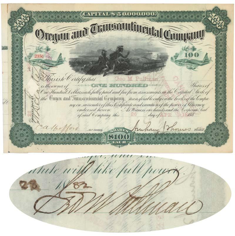 1882, Oregon. Stock certificate for 100 shares. Green/Black. Engraved panoramic vignette of Native Americnas overlooking a valley with steam locomotives and rivers. Issued to and signed on verso by George M. Pullman (1831-1897). Industrialist; Inventor. Pullman's Palace Car company was organized in 1867 after public acceptance of his "Pioneer" sleeping car. Guided by Pullman's business acumen, the company grew to become the greatest railroad car construction company in the world. Very fine condition. Diamond cut and stamp cancelled, neither affecting Pullman's large signature.