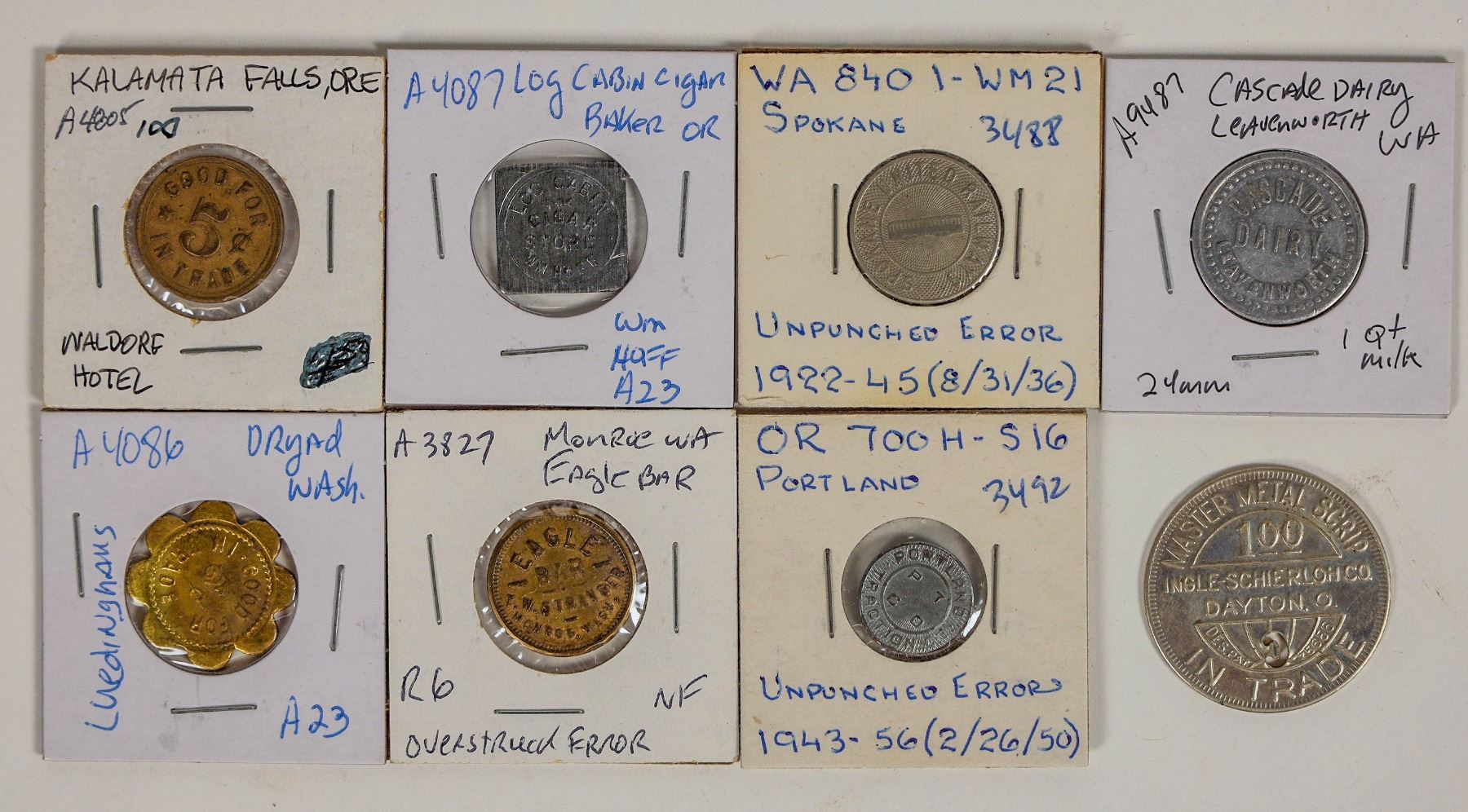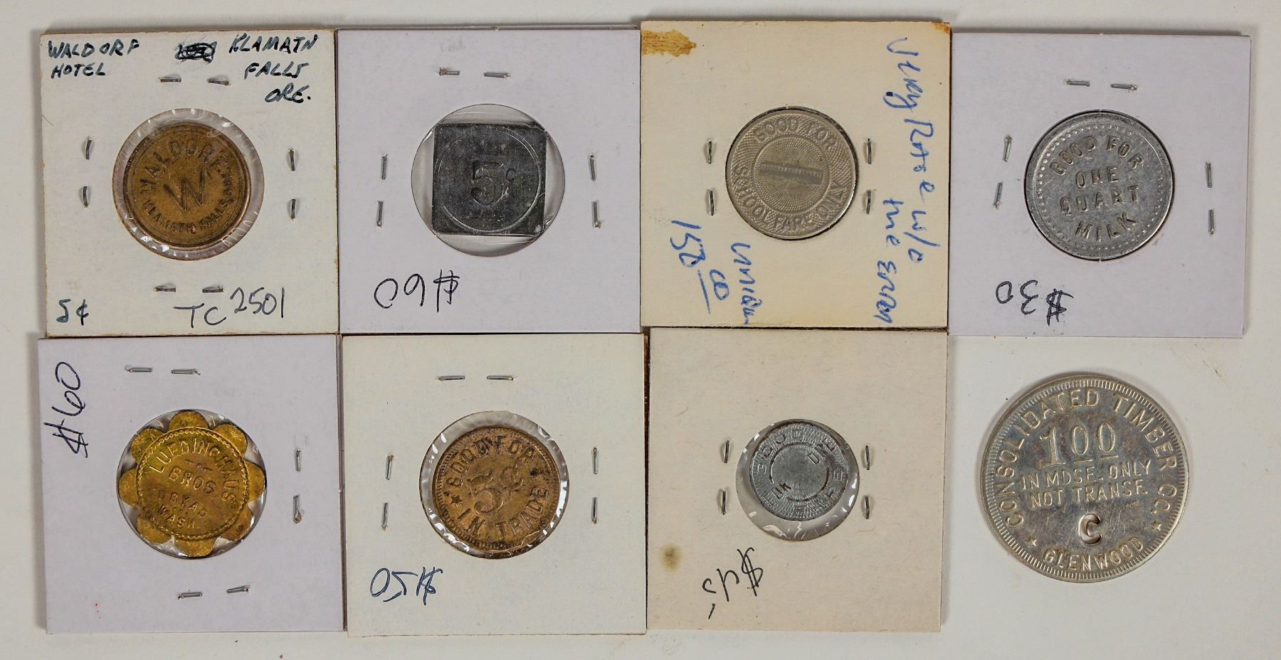 A few of the tokens are darkened or specked with rust, though the majority are in good condition with minimal scratching or discoloration; see photo. 8 tokens in total. See photo.