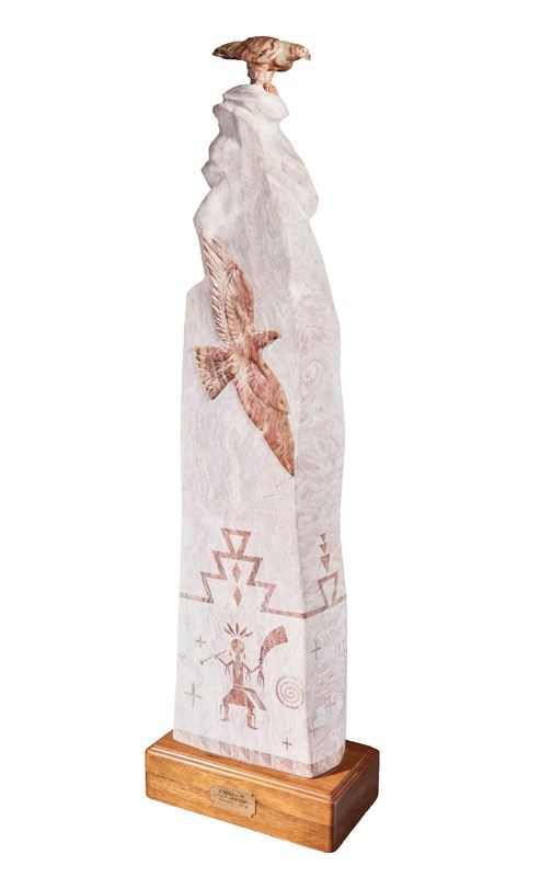 To the unaided eye, this piece appears to be in very good condition. There are no signs of damage or restoration to the piece and the surface finish is consistent. The piece is mounted to a stained wooden base, which is also in very good condition. Plate: "Eagle's (sic) of Chaco Canyon" Oreland C. Joe CA