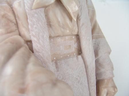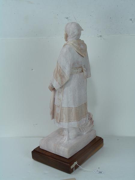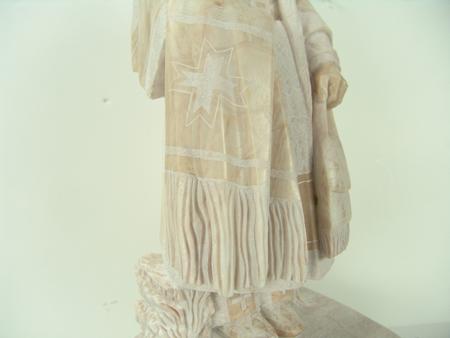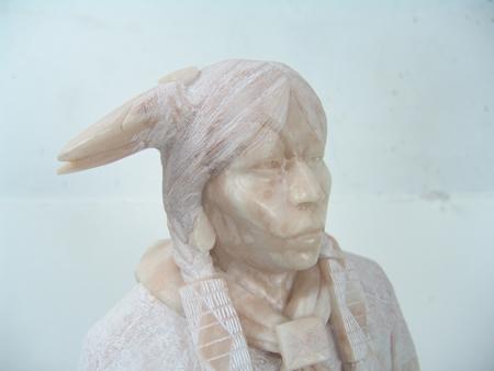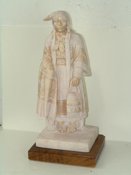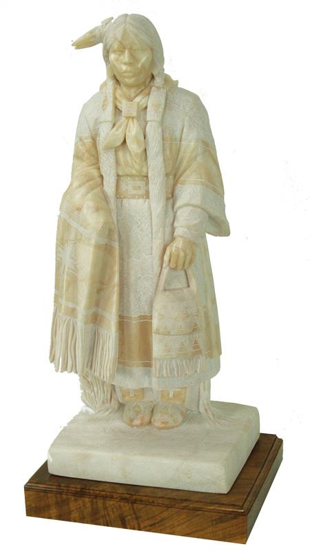 Circa 1993, Beautiful signed original hand carved stone sculpture of a Ute woman with beaded belt, bag, and fairies, dance, shawl, moccasins and leggings. Very good condition. 23-1/2" x 11" x 8"