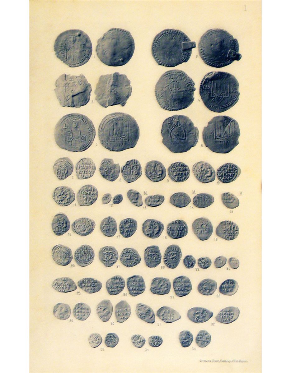 Oreshnikov, A. ИМПЕРАТОРСКIЙ РОССIЙСКIЙ ИСТОРИЧЕСКIЙ МУЗЕЙ ИМЕНИ ИМПЕРАТОРА АЛЕКСАНДРА III. ОПИСАНIЕ ПАМЯТНИКОВЪ. ВЫПУСКЪ I. РУССКIЯ МОНЕТЫ ДО 1547 ГОДА. Moscow, 1896. Small 4to, contemporary maroon quarter leather with modern marbled boards and endpapers; silk marker. xx, 232 pages; fine portrait plate of Chertkov; occasional text illustrations; 21 fine phototype plates of coins. Frontispiece stained; minor intermittent discoloration and wear. Very good, with fine plates. Still the most comprehensive work on the topic and with plates that are far superior to those of the reprints. Clain-Stefanelli 7378*. Grierson 194: "L'ouvrage classique sur les monnaies russes médiévales." Gromachevskii 251б.