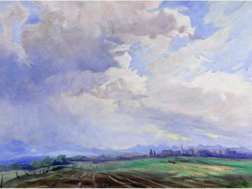 [Canadian 1932-1985] UNTITLED (FARMLAND IN THE FOOTHILLS) Oil on board 18 x 24 ins. -Signed