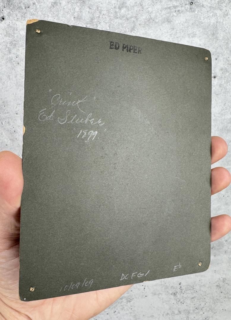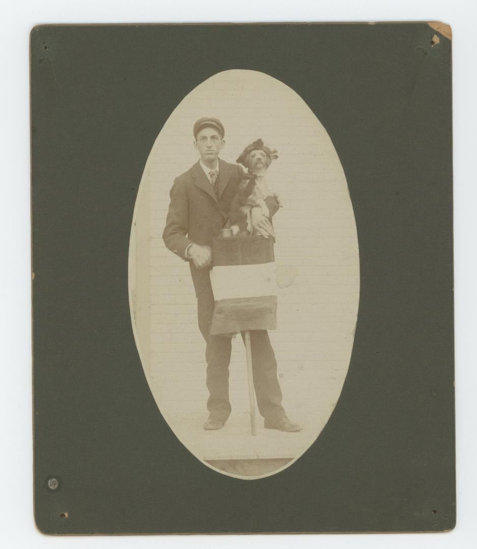 5" by 6". Unusual with a pet dog rather than a monkey.