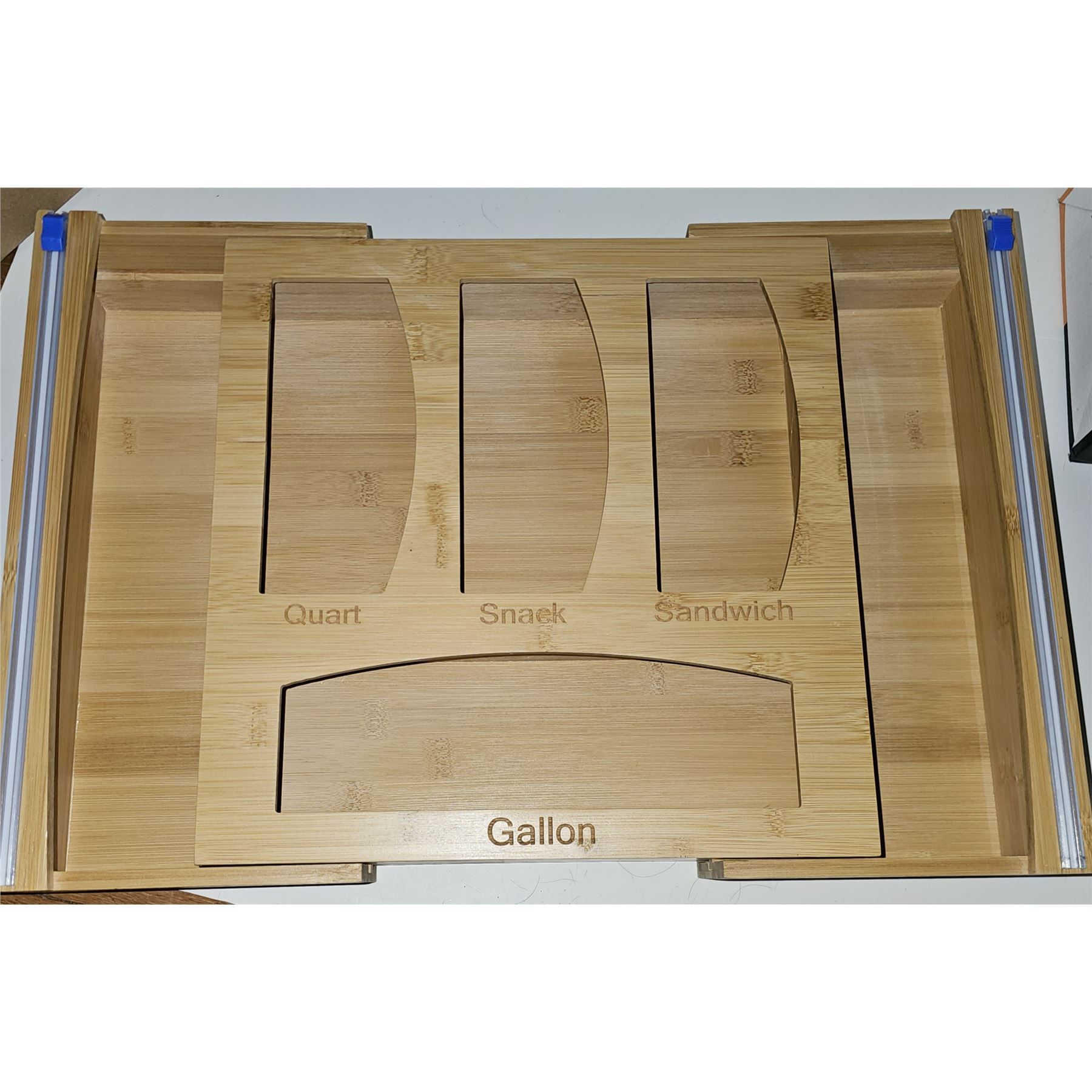 Wooden organizer for quart, snack, and sandwich bags, with a space for gallon bags, eco-friendly, new.