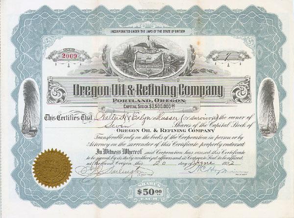 1922, Oregon. Stock certificate for 7 shares. Grey/Black with gold seal. Vignette at top center of state seal. Geysers at right and left side. Uncancelled and Very Fine.