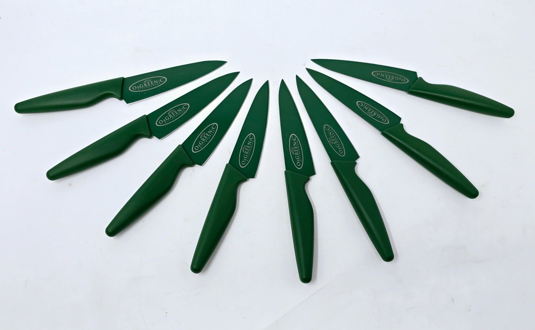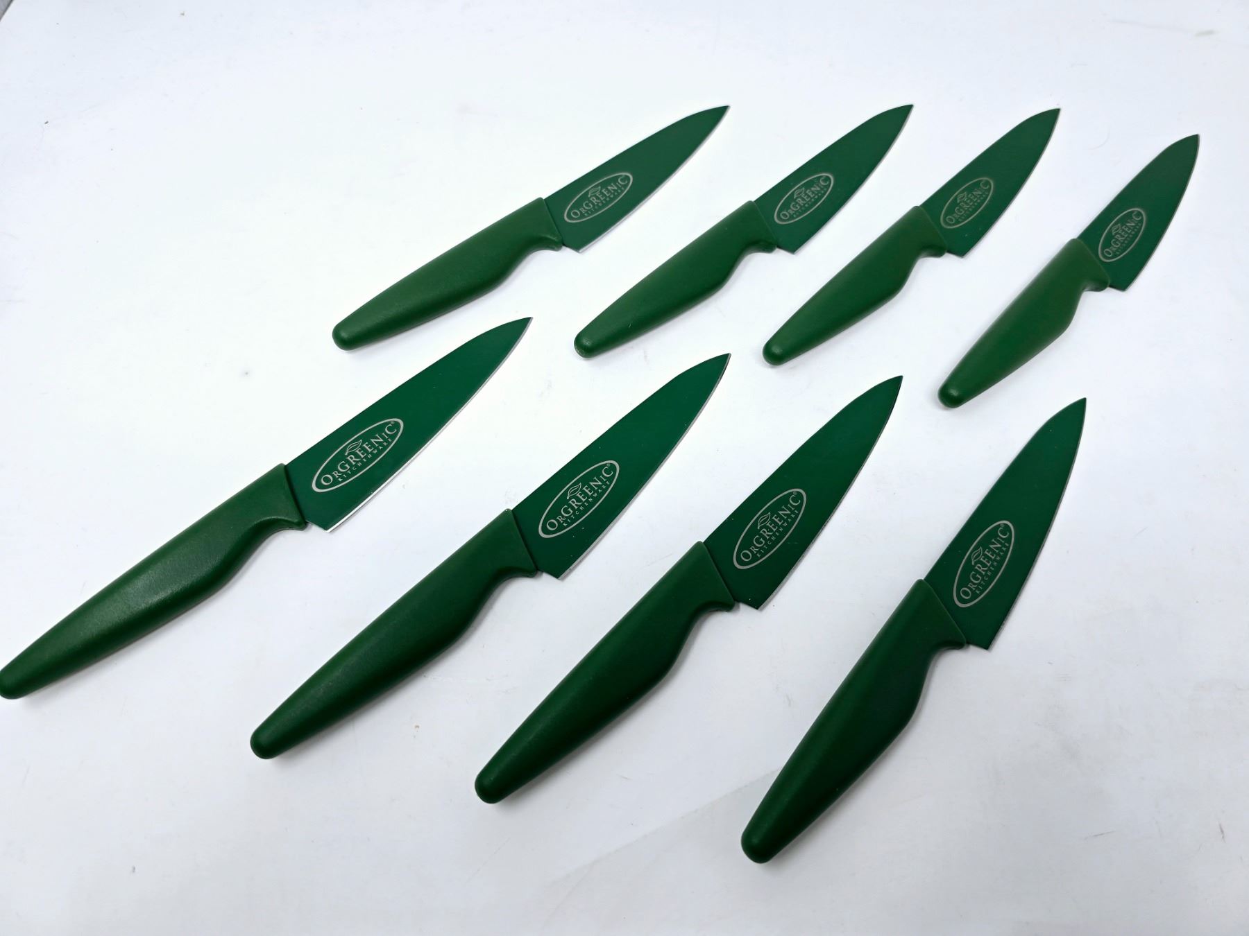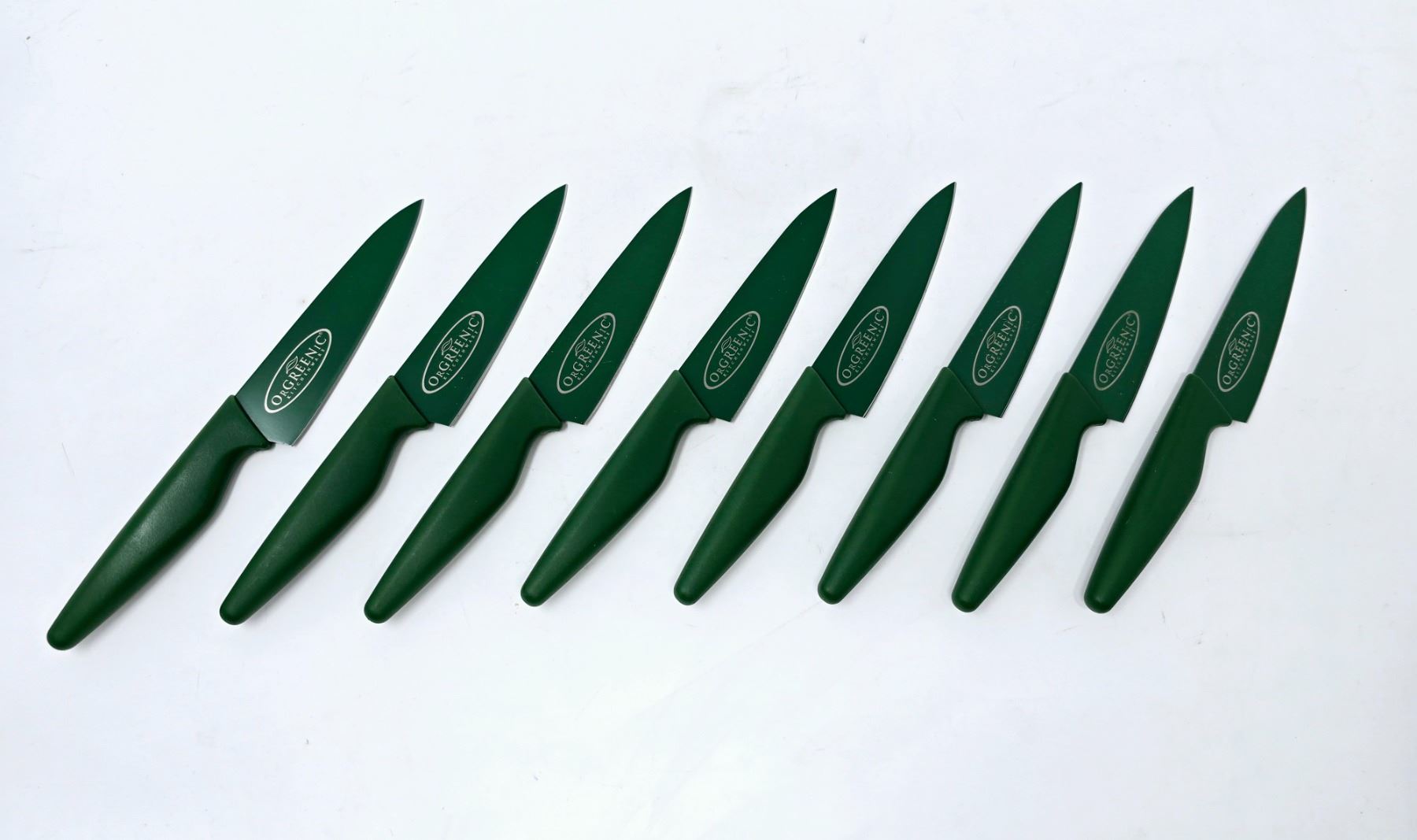 Expanded 8-piece set of Orgreenic kitchen knives in forest green. Includes an assortment of blades for chopping, slicing, and prep. Stylish, non-stick coated design with matching ergonomic handles.