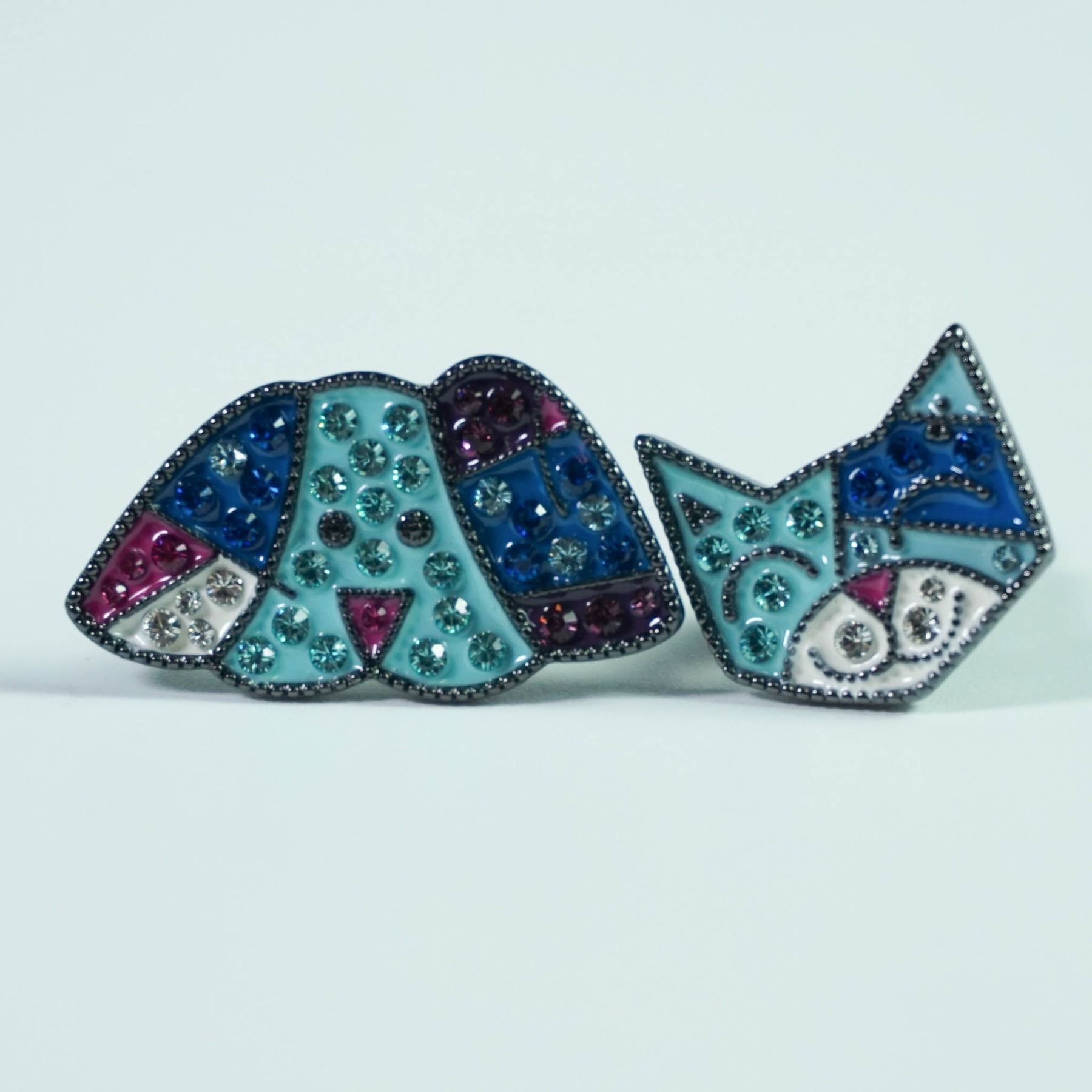 Pair of whimsical dog and cat cufflinks designed by pop artist Romero Britto for Britto's Jewellery Collection by Orianne Collins. Each cufflink features a playful stylized dog and cat decorated in multicolored enamel with rhinestone accents in vibrant shades of red, pink, yellow, and orange. The reverse is marked BRITTO, and the pair is presented in its original black Britto x Orianne Collins box.