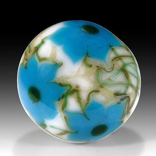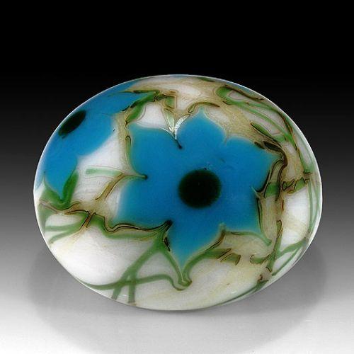 Orient & Flume Art Glass blue flowers on white surface-design paperweight. Three, spaced, blue flowers, grow on green vines, which trail across the white surface of the piece. Signed. Diameter 2 3/4". Circa early 1970s.
