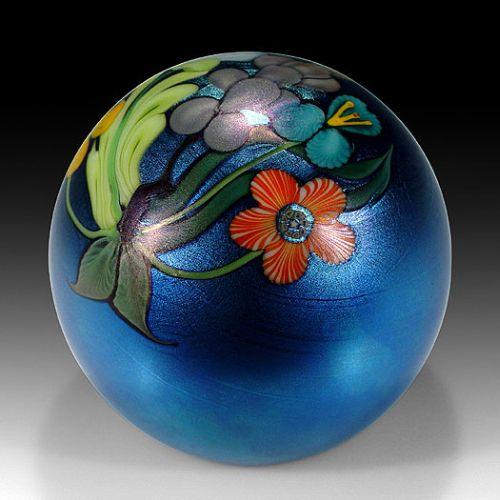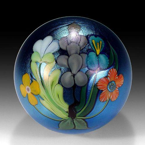Orient & Flume Art Glass 1982 bouquet on blue surface design paperweight. A stem of lavender lupine, is bordered by assorted wildflowers in white, yellow, blue, and red, on an iridescent dark blue surface. Signed/dated. Ed Seaira, artist. Diameter 2 15/16".