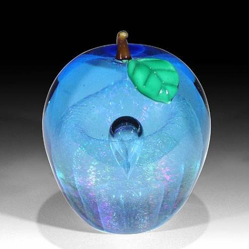Orient & Flume Art Glass translucent blue apple paperweight, with a central bubble and silver veils on the interior. Signed. Diameter 3 1/8".