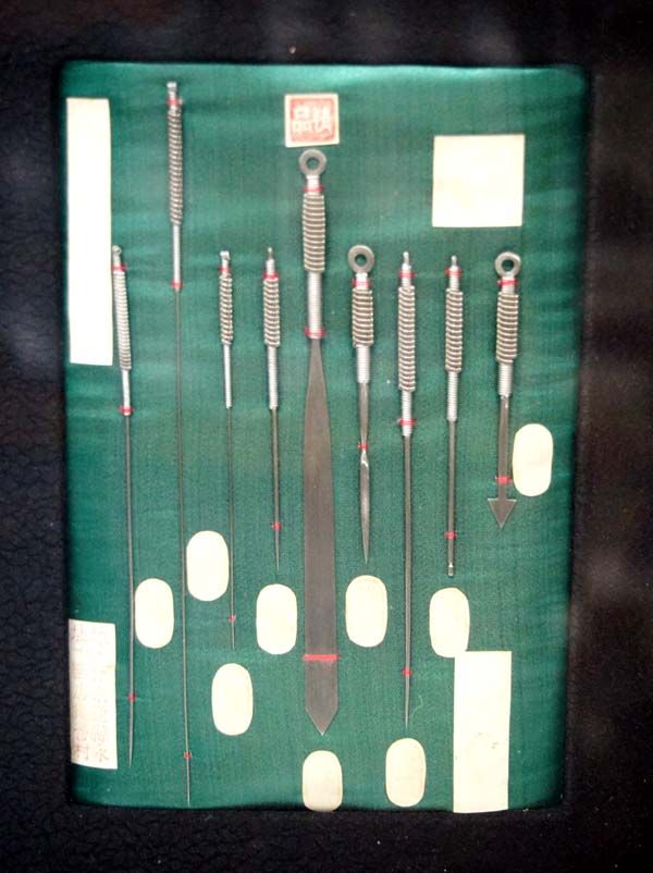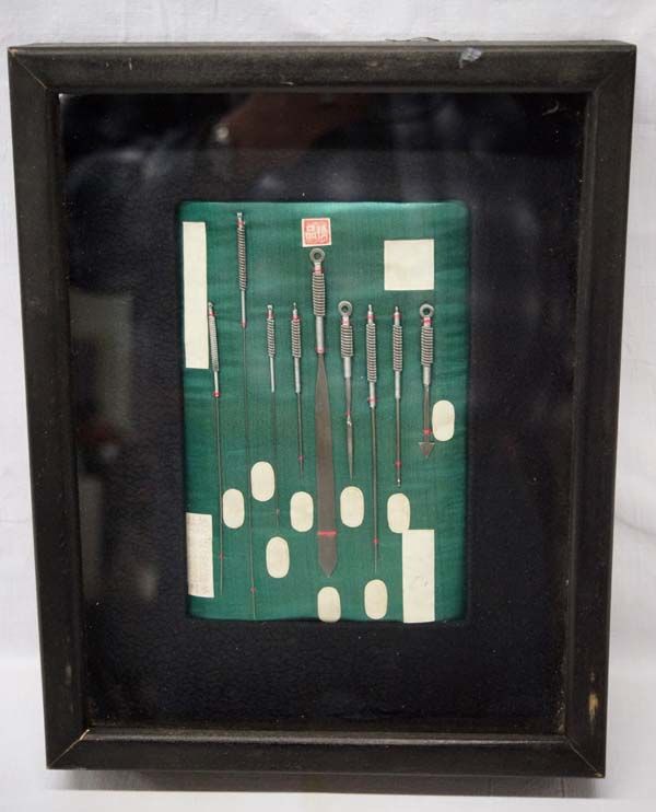 Oriental Accupuncture Instruments Display, collection of 9 tools in glass enclosed display, measures 7.5''L x 5''W x 2''D