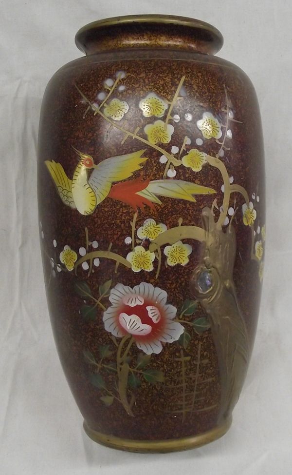 Oriental Fine Porcelain Phoenix Bird Jar. Beautiful older piece of orientalia. Tall jar, measuring 12'' x 7'' base, Motifs include a phoenix bird amid branches of cherry blossoms. Adding interest to the piece is the heavy paint embossing of the tree trunk which has a piece of abalone shell inset.