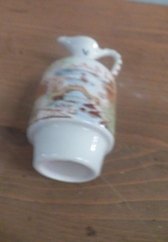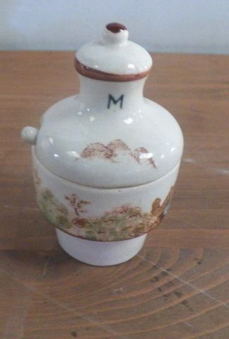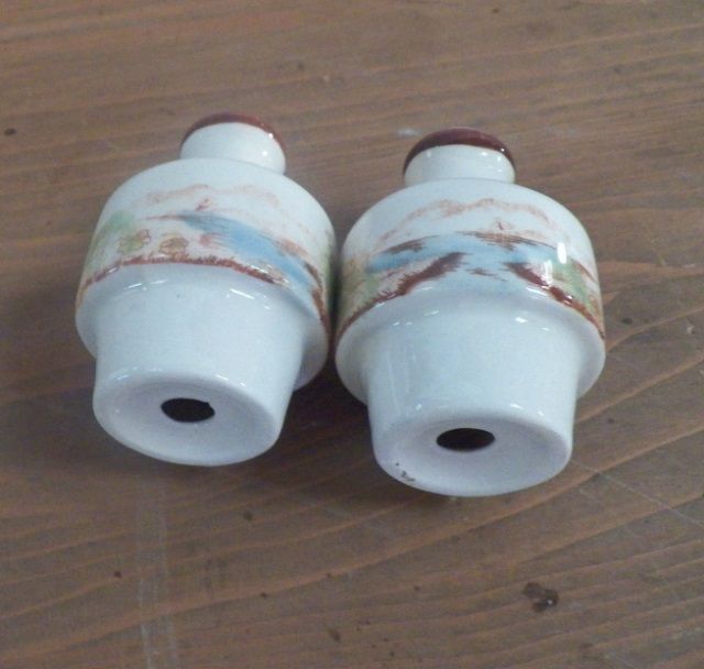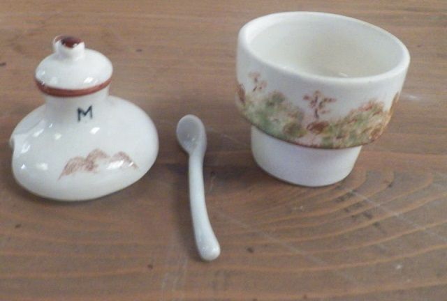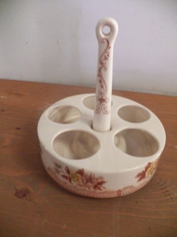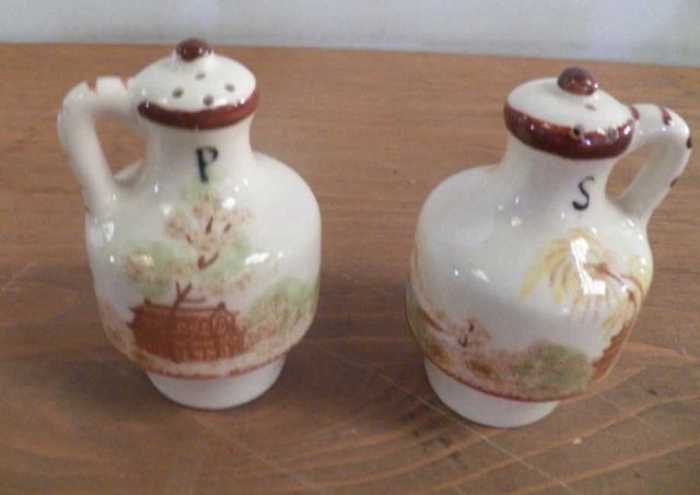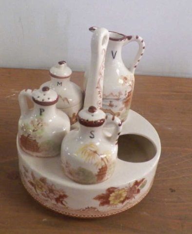 turn table base holds salt, Pepper, Milk has spoon , Vinegar---oil cruet is missing--- each piece has a marking for what it is... no chips or cracks a rare find for this dinner ware