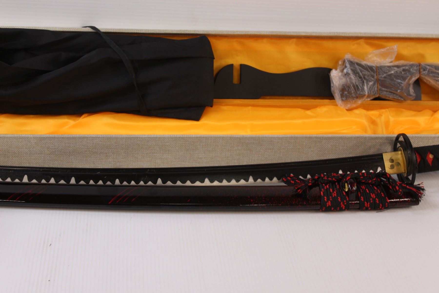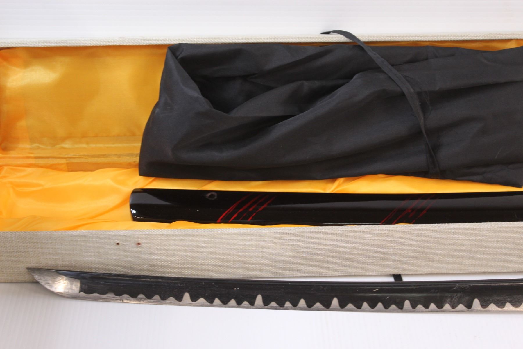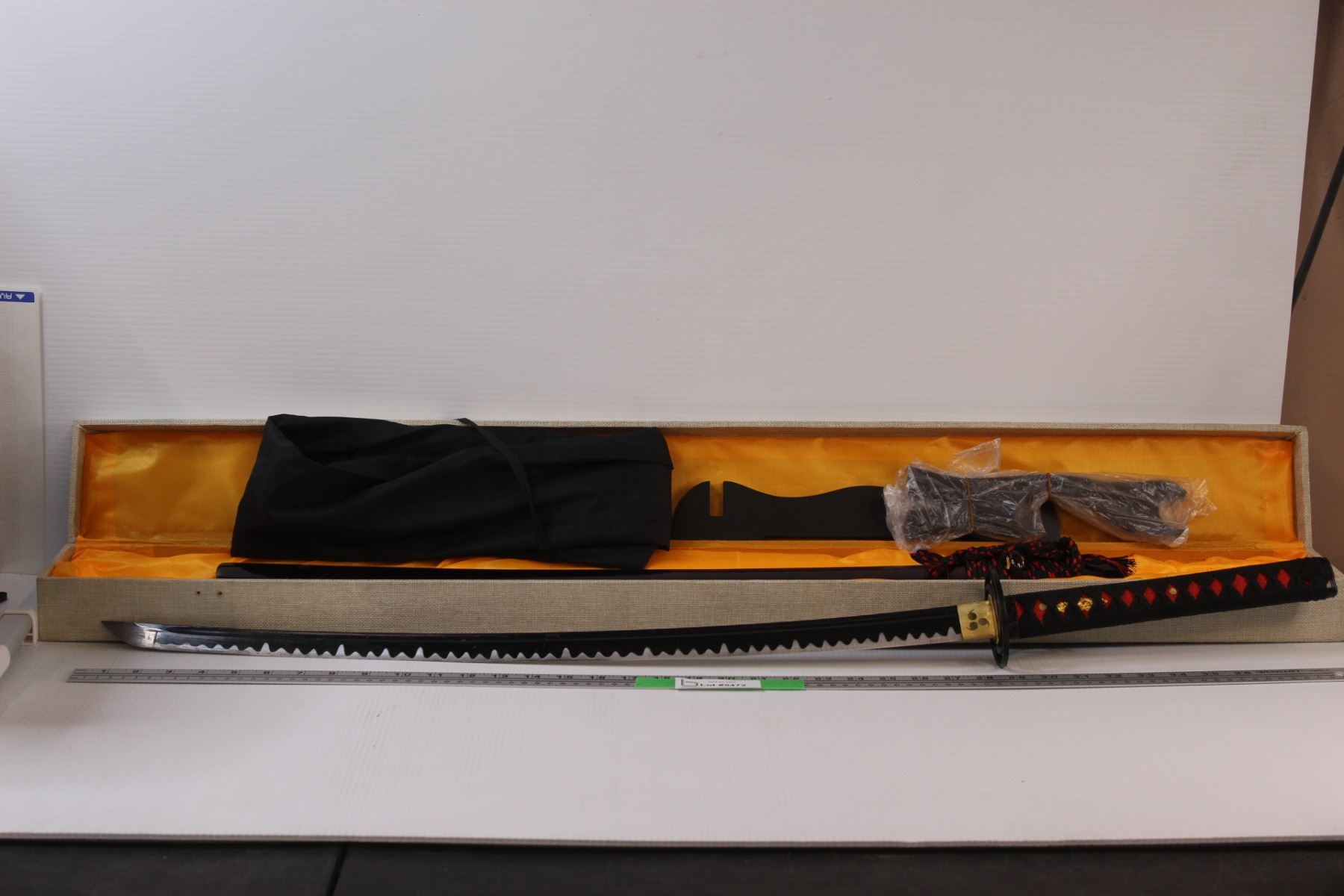 Oriental Katana Style Metal Sword with Stand in Tweed Covered Box 36+" Long Made In China