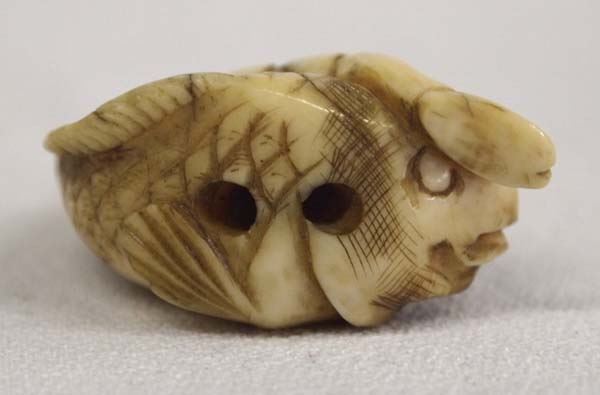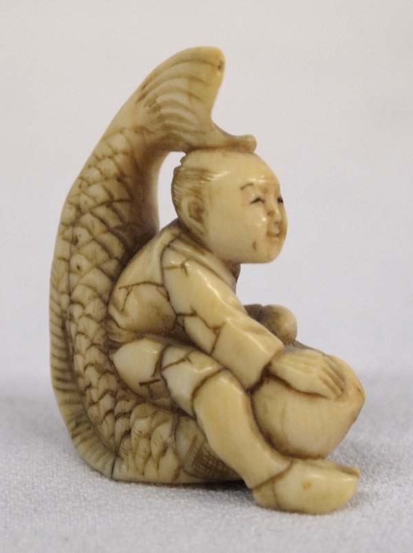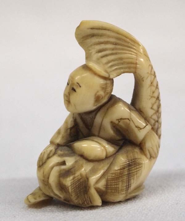 Oriental Netsuke Figurine, Carved Bone Man Sitting on Fish, measures 1'' x 1.5''