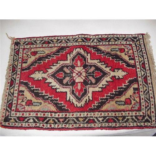 A small wool rug, 17" X 24", hand woven with geometric designs of gold, black, red, blue. Very short fringe. Condition is good, no wear spots.