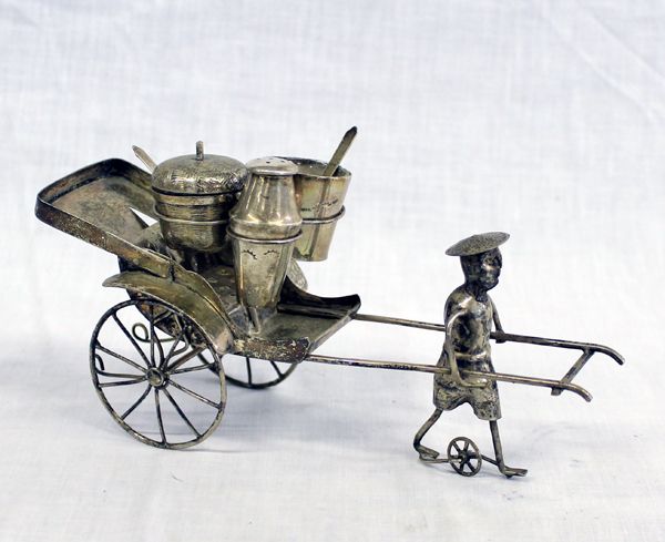 From the Proctor Estate, Silver City, NM. Vintage Sterling Silver Oriental Hong Kong Chinese Rickshaw Moving Condiment Set solid Silver. Measures 8''L x 4''H x 3''W. Sauce Pots, small serving spoons, & shaker.