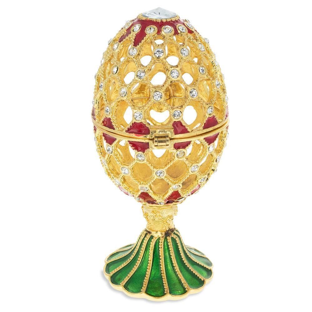4.8" Oriental Style Royal Inspired Russian Egg 4.8 Inches Tall X 2.3 Inches Diameter Pewter, Crystals Hand Made Gift Boxed This sparkling Faberge-inspired egg is adorned with clear Austrian crystals. It opens on a hinge and has a magnetic closure to keep the box securely shut. The piece also comes in a beautiful gift box.