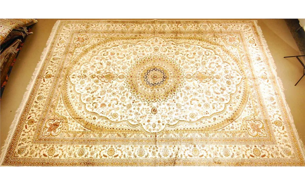 Beautiful Oriental Tabriz silk foundation hand made rug. Large. White base with beige and gold accents.